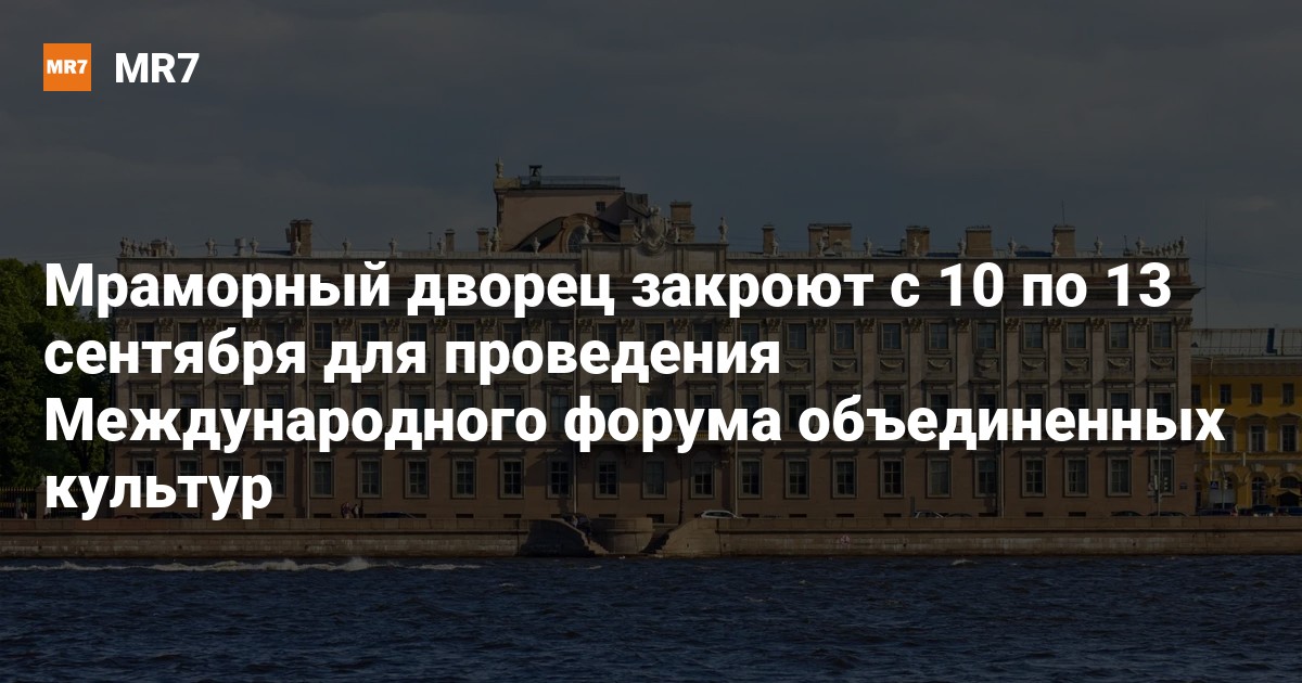 Мраморный дворец Русского музея закроют для посетителей с 10 по 13 сентября для подготовки и проведения мероприятий Международного форума объединенных культур. Об этом в пресс-службе музея сообщили 3 сентября.