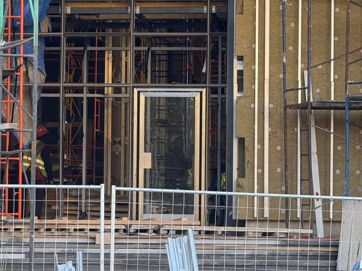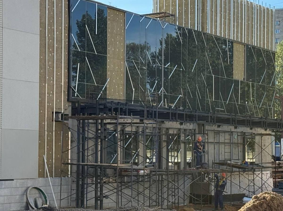 Фасад, который выходит на улицу Васи Алексеева, скоро обзаведется витражом — он расположится между входом и выходом. На колоннах входной группы уже появились первые облицовочные плиты из натурального камня.