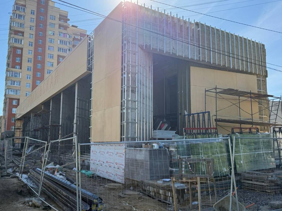 Вестибюль станции «Путиловская» будущей Красносельско-Калининской (коричневой) линии метрополитена остекляют и готовят к работам по облицовке. Об этом 7 сентября рассказал автор telegram-канала «Подземник».