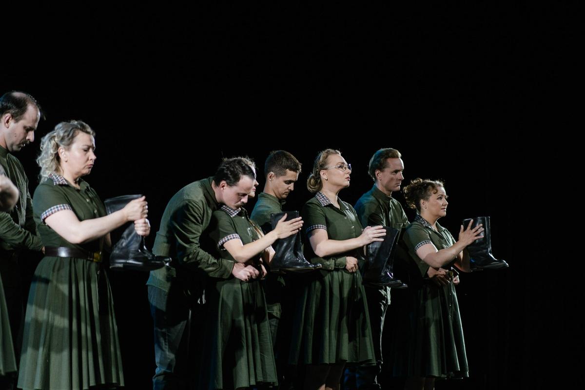 Билетёры приглашают в зал. Спектакль начинается. Всё чётко, отрепетировано, каждый жест отчётливо понятен. После некоторых песен зрители начинают аплодировать — не хлопками — а поднятыми вверх ладонями — чтобы увидели актёры. Те не кланяются — переходят от одной композиции к другой. Среди песен — «На безымянной высоте», «Бери шинель, пошли домой», «Журавли».