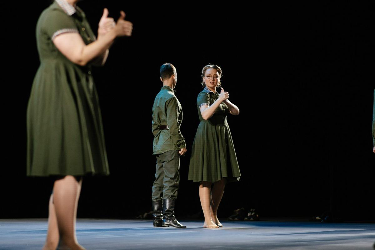 — Перекладывая песни на жестовый язык, мы разбирали их вместе с актёрами, обсуждали терминологию, — рассказывает директор театра «Недослов»: — В песнях очень много заложено. «Над нами мессеры кружили, и было видно, словно днём». Что это значит? Надо было понять, что такое самолет «Мессершмитт», понять, как он стреляет. «Было видно словно днем». О чём речь? О прожекторах. Или: «Землянка наша в три наката, сосна, сгоревшая над ней». «Три наката»: а это что? Мы погружались в события. Актёры должны были увидеть образы — чтобы потом исполнить.