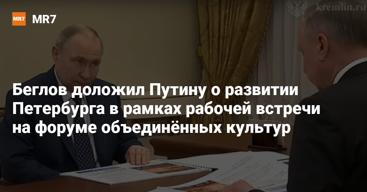 Губернатор Петербурга Александр Беглов встретился с президентом России Владимиром Путиным в рамках международного форума объединённых культур, рассказал сам глава города в своём telegram-канале 13 сентября.