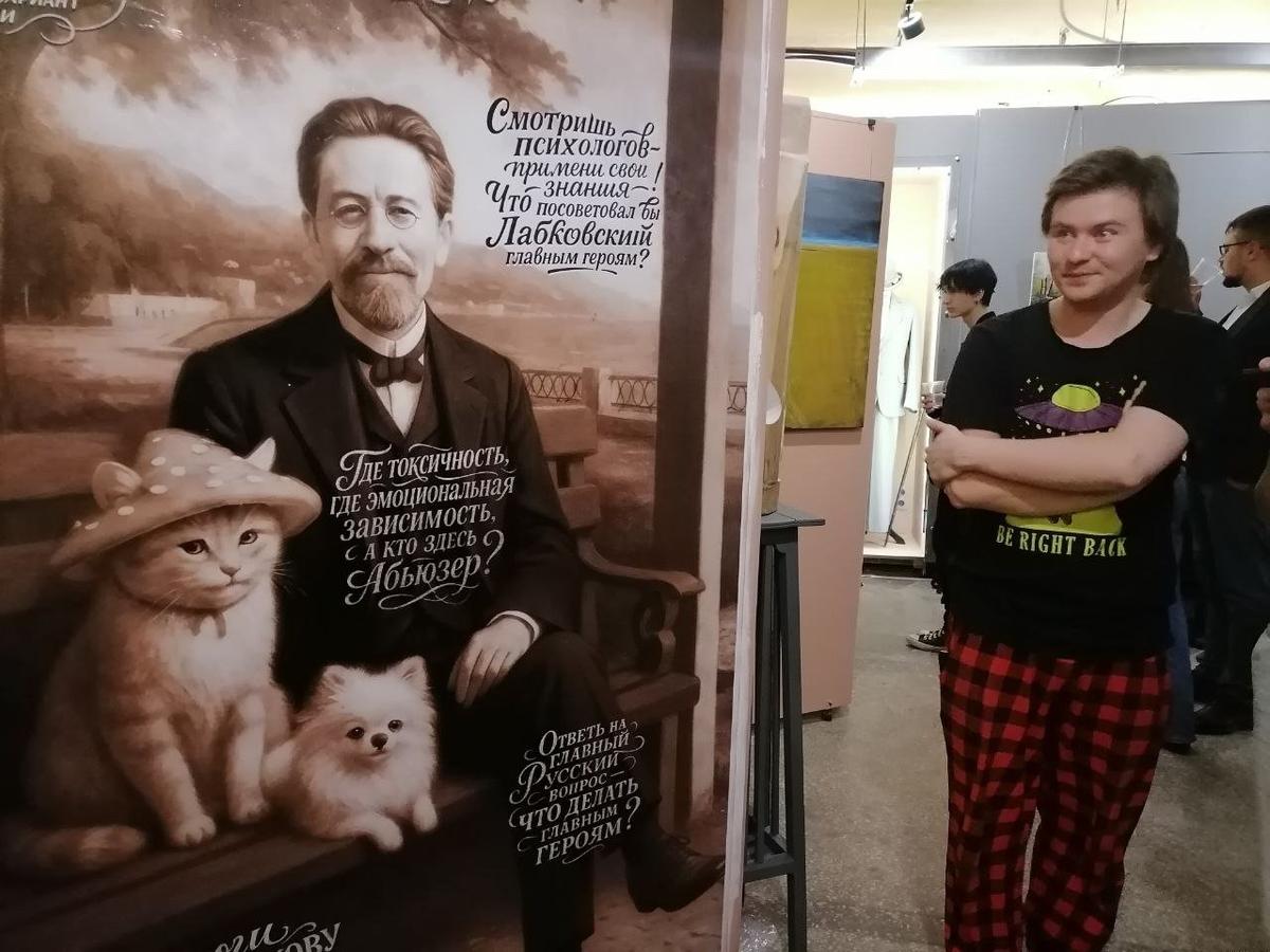 «Дама с собачкой» и до сих пор не перестаёт вдохновлять художников. Продолжая творческую линию Чехова-Хейфица, на открытии выставки петербургский стрит-артист Олег Лукьянов представил свою новую работу.