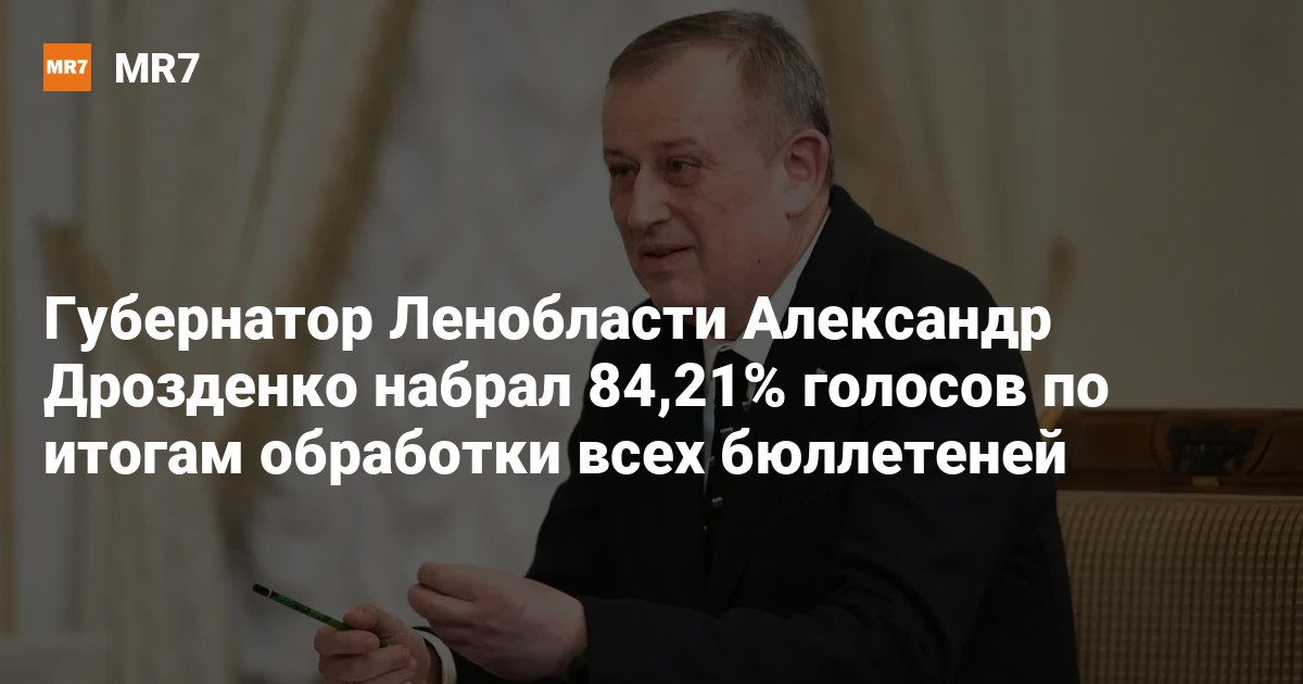 Действующий губернатор Ленобласти Александр Дрозденко набрал 84,21% голосов после обработки 100% протоколов УИК, следует из данных ЦИК РФ. Главой региона на следующие пять лет Дрозденко выбрали 756 885 человек.