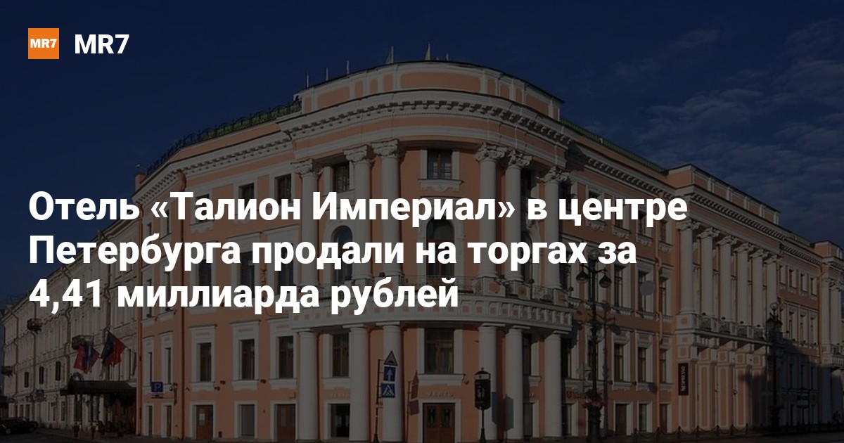 Пятизвёздочный отель «Талион Империал» в доме Елисеевых на Большой Морской улице, 14, продали на торгах за 4,41 миллиарда рублей, сообщает пресс-служба АО «РАД» 15 сентября.