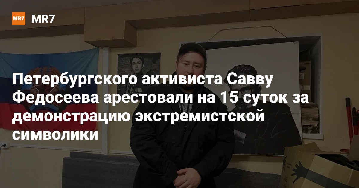 Кировский районный суд Петербурга назначил 15 суток ареста петербургскому активисту, экс-кандидату в мундепы Савве Федосееву по статье 20.3 КоАП РФ (пропаганда либо публичное демонстрирование нацистской символики). Заседание проходило в закрытом режиме. Об этом 15 сентября сообщил адвокат Алексей Калугин.