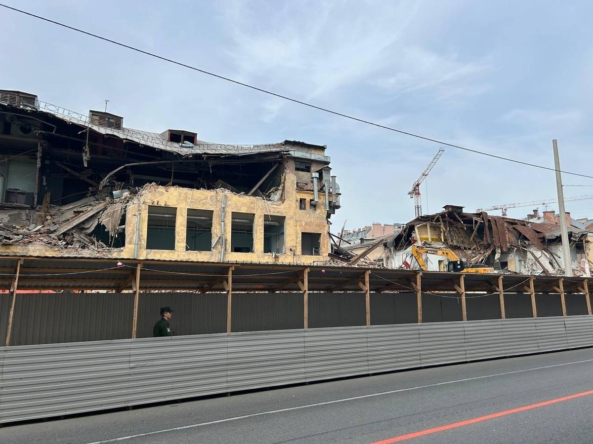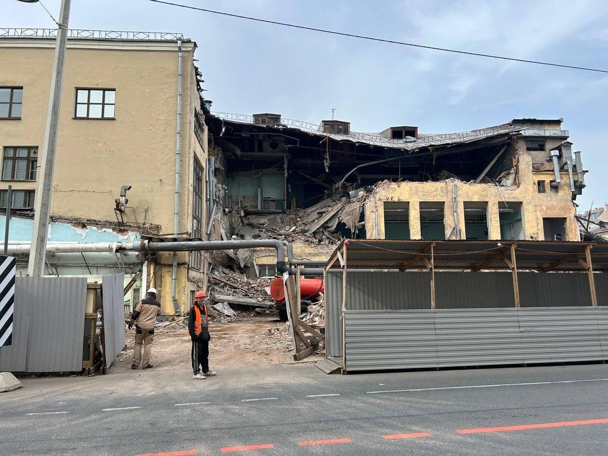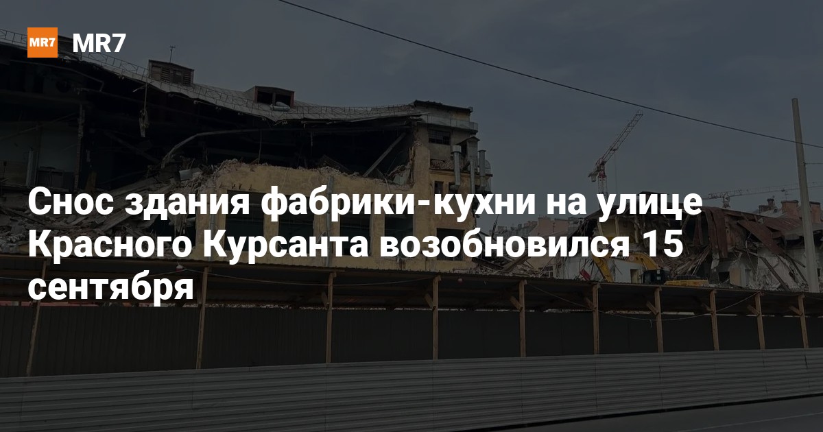 Работы по сносу здания бывшей фабрики-кухни Ленинградского союза потребительских обществ (ЛСПО) на улице Красного Курсанта, 19, возобновились днём 15 сентября, сообщает корреспондент MR7.