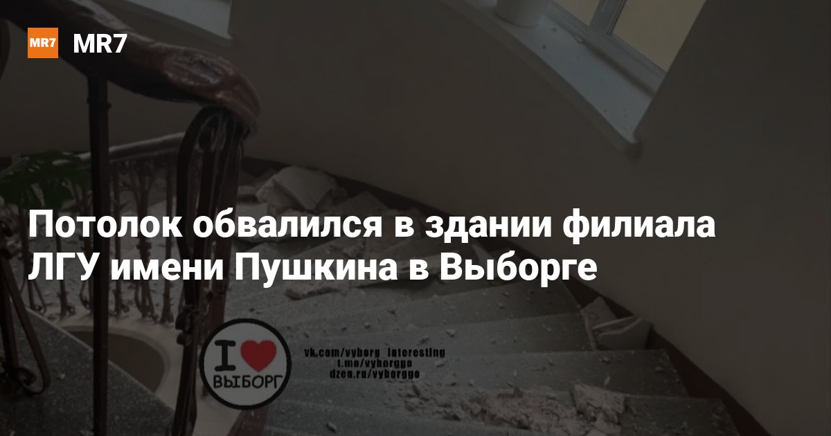 Потолок обвалился в филиале ЛГУ имени Пушкина на Выборгской улице, 2, в Выборге во время занятий, сообщили студенты в социальных сетях 17 сентября. По предварительным данным, обошлось без пострадавших.