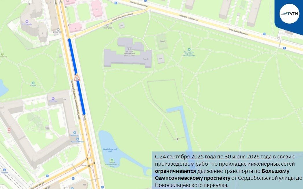 С 24 сентября 2025 года по 30 июня 2026 года ограничивается движение по Большому Сампсониевскому проспекту на участке от Сердобольской улицы до Новосильцевского переулка. Работы связаны с прокладкой инженерных сетей.