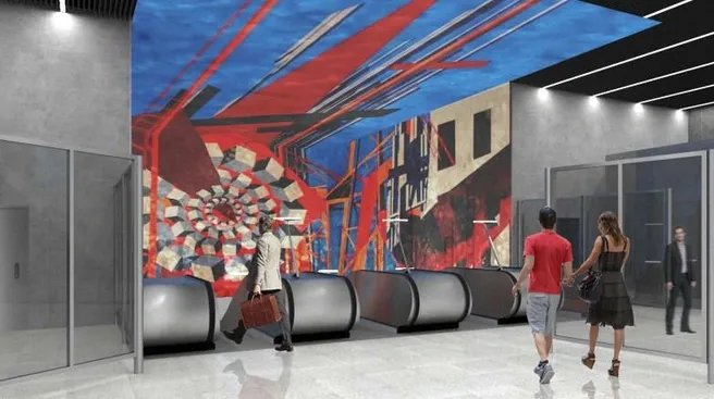 «Интерьер вестибюля будет решён в оттенках серого и чёрного, что подчеркнёт индустриальный стиль. Контраст с приглушённой отделкой создадут большие витражные окна по обеим сторонам зала, наполняющие пространство естественным светом», — отметили в «Подземнике».