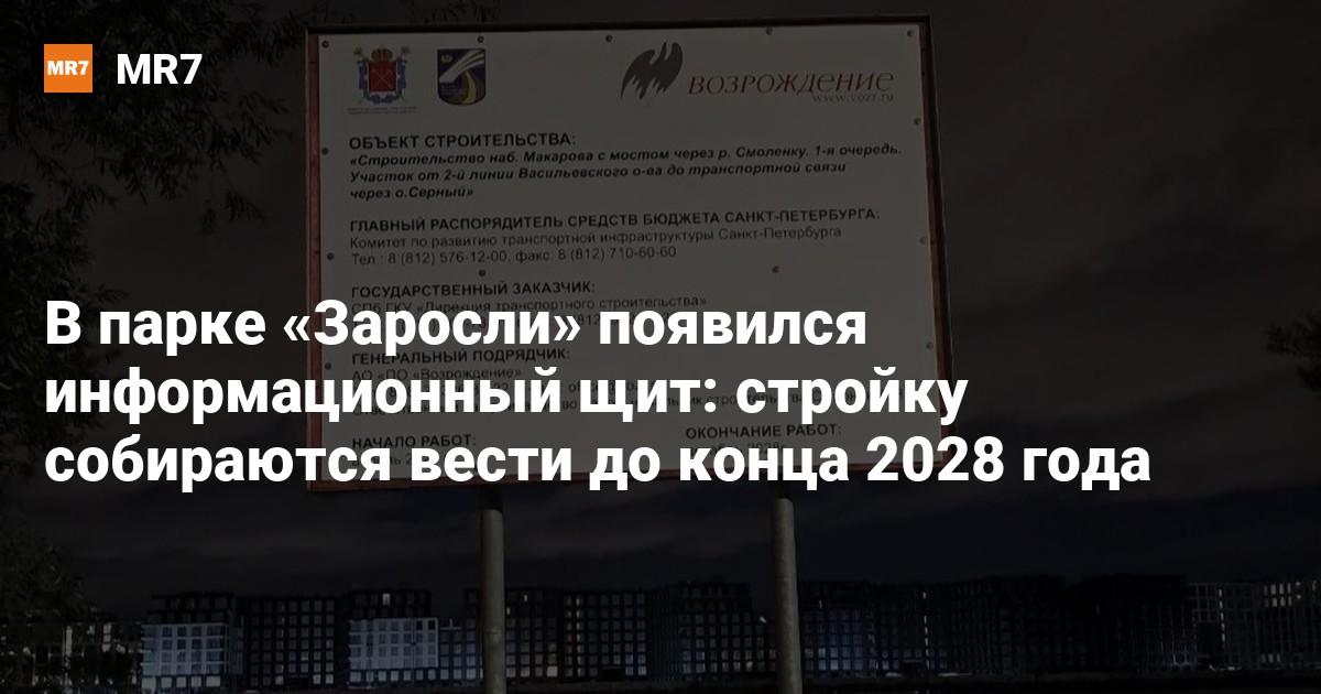 Защитники парка «Заросли» на острове Декабристов накануне вечером сигнализировали о появлении на местности информационного щита со сведениями о строительных работах. Их началом указан апрель нынешнего года, а концом — декабрь 2028 года.