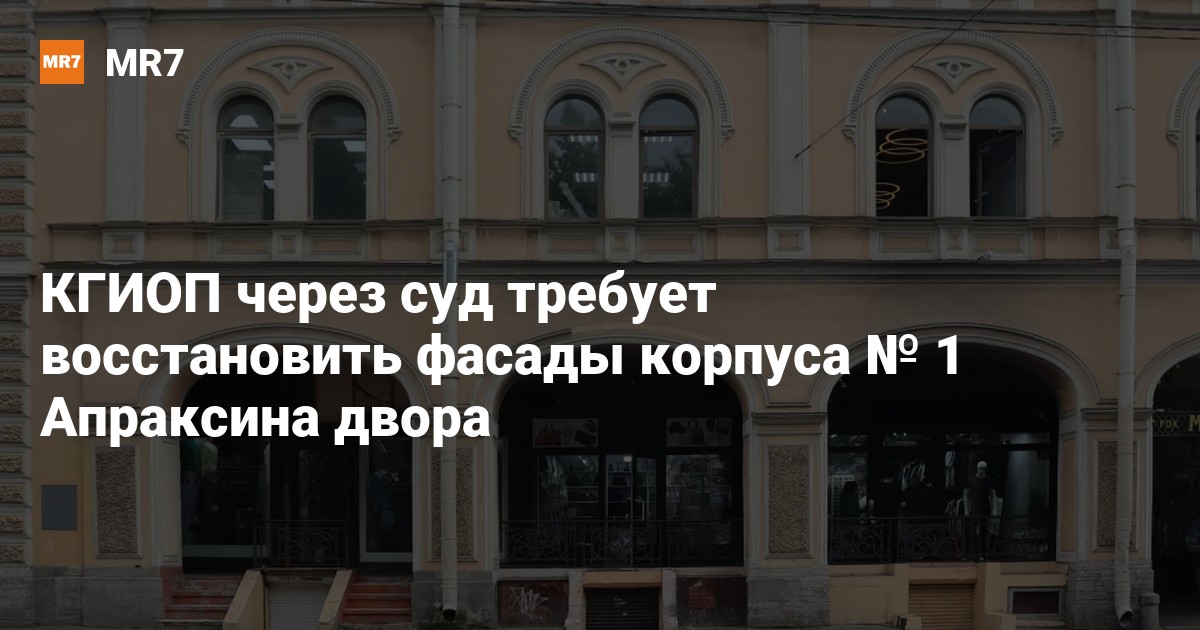 Комитет по государственному контролю, использованию и охране памятников истории и культуры (КГИОП) 24 сентября подал в Куйбышевский районный суд иск с требованием демонтировать незаконно установленное оборудование и провести реставрацию фасадов корпуса № 1 Апраксина двора.