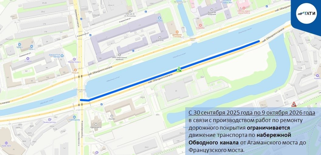 - С 30 сентября 2025 года по 9 октября 2026 года введут ограничения на набережной Обводного канала от Атаманского до Французского моста.