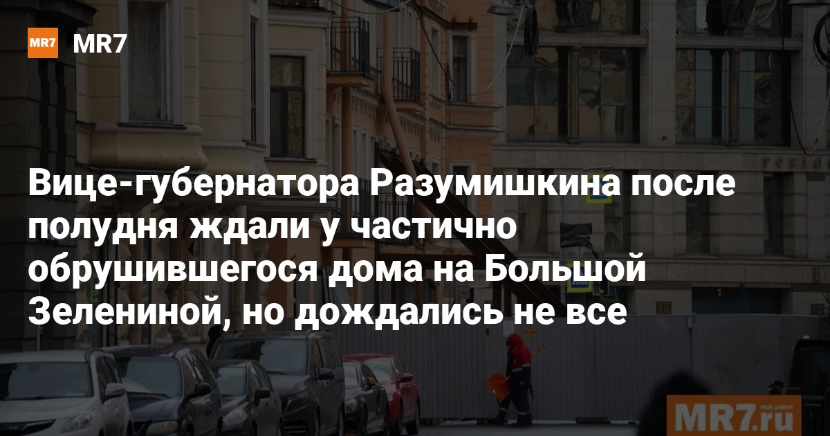 Вице-губернатора Петербурга Евгения Разумишкина у дома № 1/44 на Большой Зелениной улице, частично обрушившегося полтора года назад, расселённые жильцы ждали 14 октября после полудня (его приезд анонсировали накануне в чате дома). Это не была официальная встреча, но кто-то всё же надеялся задать свои вопросы. Однако чиновник, по словам видеооператоров телеканала, стоявших у здания около 12 часов дня, вице-губернатор посетил дом раньше — около 10 утра, пока рядом не было «местных».