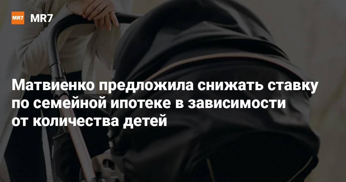 Председатель Совета Федерации Валентина Матвиенко предложила сделать ставку по семейной ипотеке гибкой — чем больше детей в семье, тем ниже процент. С таким предложением она выступила на заседании Совета при президенте России по вопросам демографической и семейной политики. Об этом 23 октября сообщило ТАСС.