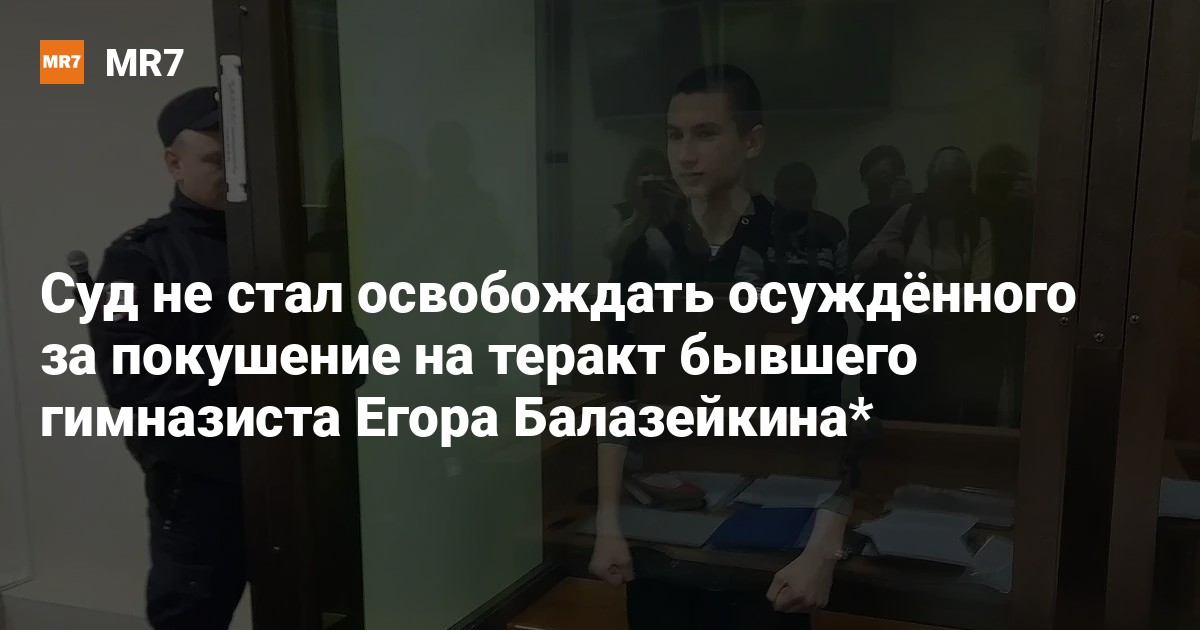 Колпинский районный суд отказал в освобождении приговорённого к шести годам лишения свободы за покушение на теракт (статьи 30 и 205 УК РФ) гимназиста Егора Балазейкина* от наказания в связи с состоянием здоровья. Судебное заседание по этому вопросу состоялось 24 октября. Оно прошло в закрытом режиме — не пустили даже мать Егора* Татьяну Балазейкину. Сам Егор* на заседании тоже не присутствовал даже по видеосвязи. Суд указал, что заболевание Егора* не входит в перечень заболеваний, препятствующих отбыванию наказания.