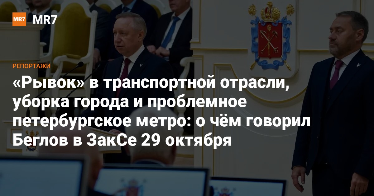 Губернатор отметил, что в 2019 году Петербург мог потерять метростроение как отрасль из-за банкротства «Метростроя». По словам Беглова, город «сделал практически невозможное» для того, чтобы были введены в эксплуатацию станции «Проспект Славы», «Дунайская» и «Шушары». Затем глава Петербурга посоветовал депутатам посетить станцию «Горный институт» и отметил, что она «получилась очень хорошая».