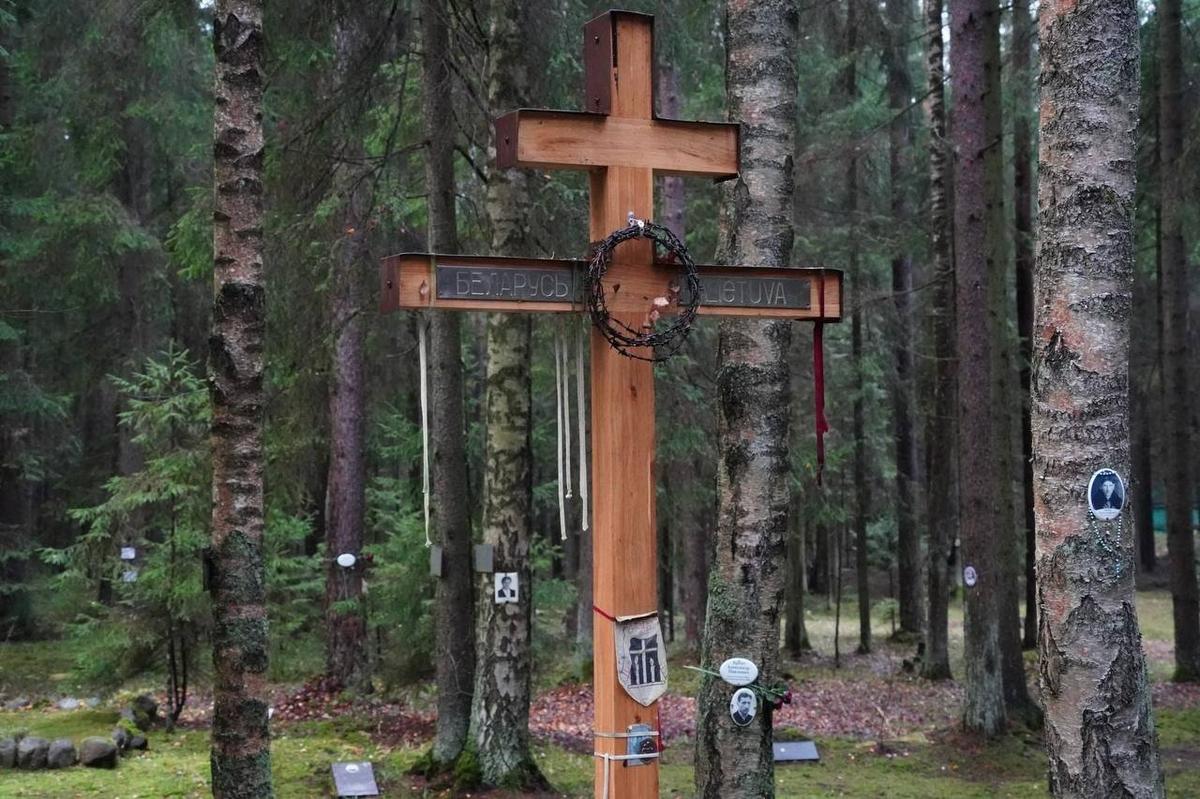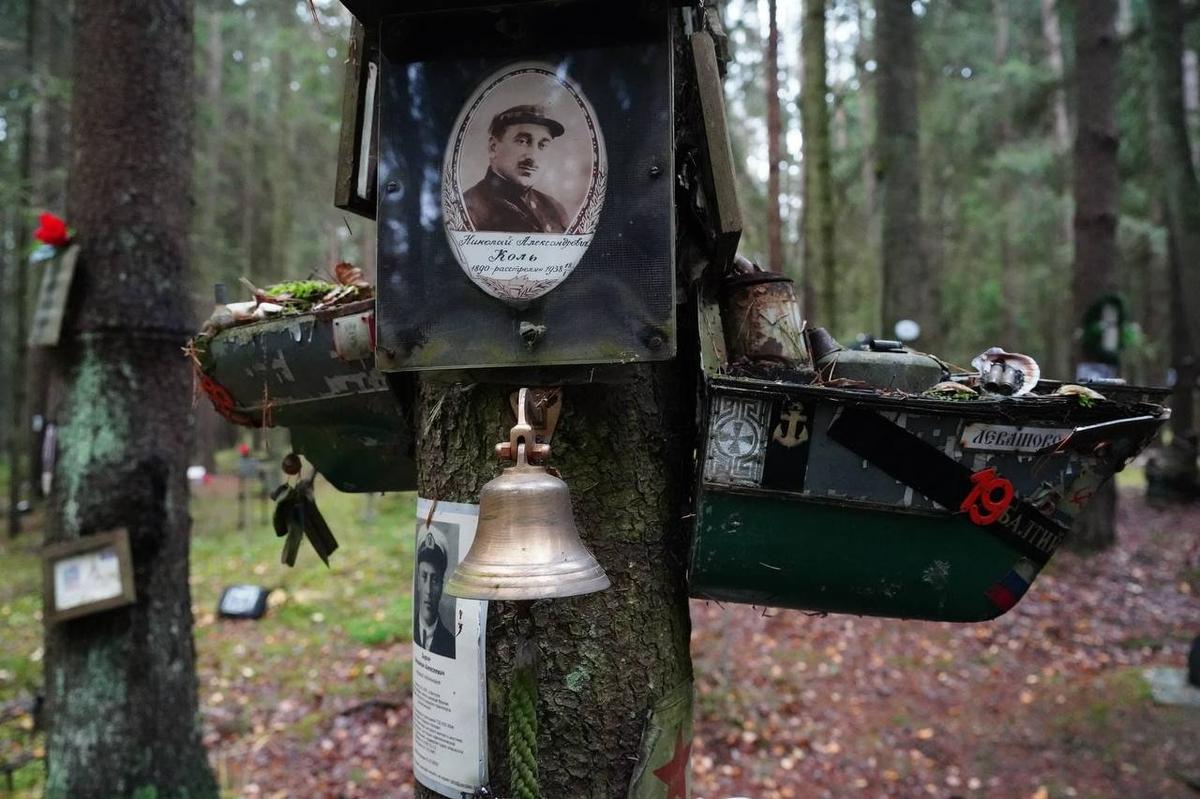 Над головами гудят самолёты, напоминающие о том, что рядом расположен аэродром. Возвращаемся по тропам. Ступаем по корням деревьев, кое-где видны грибы. Некоторые таблички истлели от времени. Часть из них прикрепили к коре деревьев скотчем: чтобы крепче держалась память, сопротивлялась паутине и дождям. Ещё бы: ведь доподлинно неизвестно, где именно похоронен репрессированный родственник. Когда здесь стало можно устанавливать памятные знаки, люди принялись приносить фотографии, повязывать ленты, ковать фигурки — чтобы была возможность скорбеть, чтобы было место для горевания.