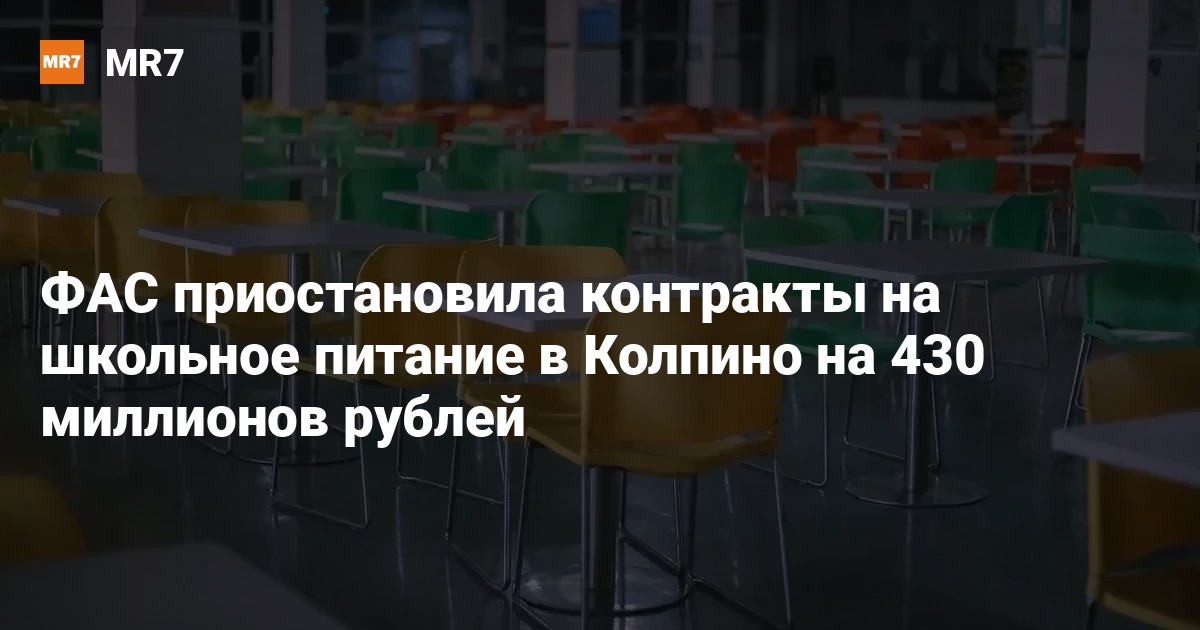 Федеральная антимонопольная служба (ФАС) приняла решение о приостановке контрактов на общую сумму около 430 миллионов рублей, связанных с поставкой продуктов питания в школы района Колпино Петербурга, сообщает 1 ноября 78.ru.