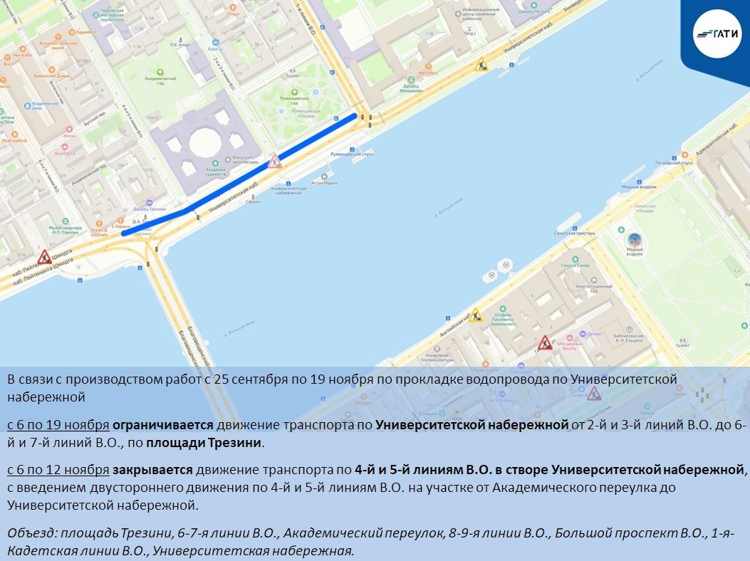 Кроме того, с 6 по 19 ноября движение будет ограничено по Университетской набережной — от 2-й и 3-й линий Васильевского острова до 6-й и 7-й линий, а также по площади Трезини.