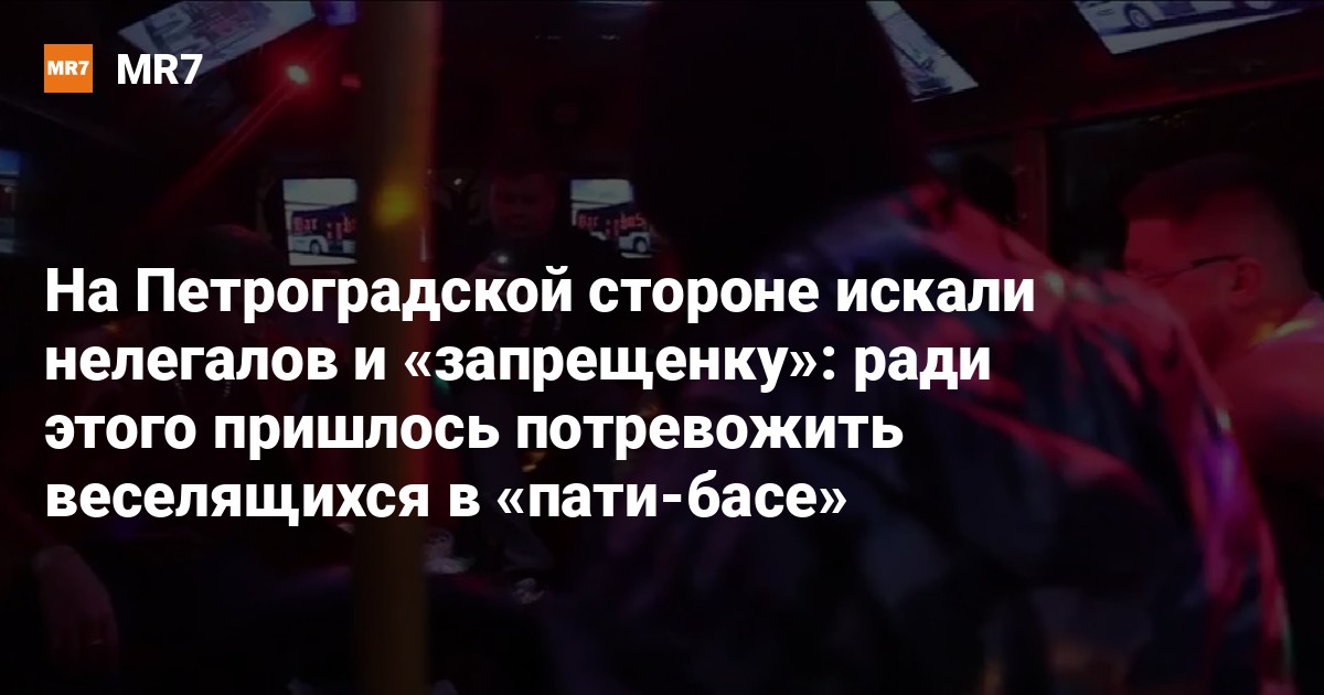 Правоохранители провели рейд по Петроградскому району. Как сообщает 6 ноября ГУ МВД по Петербургу и Ленобласти, искали нелегальных мигрантов и запрещенные вещества. Ни того, ни другого не оказалось в так называемом «пати басе» — арендованном для передвижной вечеринки автобусе, пассажирам которого пришлось на время прервать веселье.