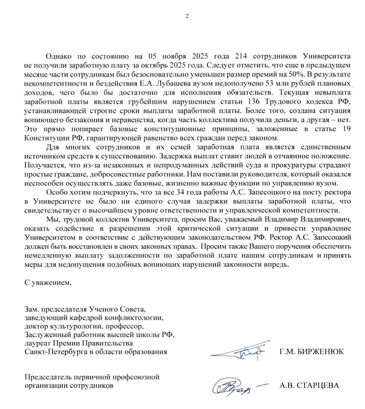 Авторы письма утверждают, что после отстранения ректора Александра Запесоцкого в сентябре этого года в вузе начались финансовые проблемы. По их словам, исполняющий обязанности руководителя Елена Лубашева проявила бездействие, из-за чего университет недополучил 53 миллиона рублей плановых доходов — этих средств хватило бы на выплату зарплат.