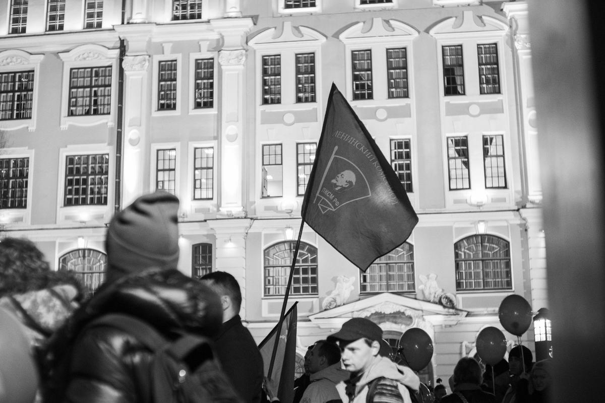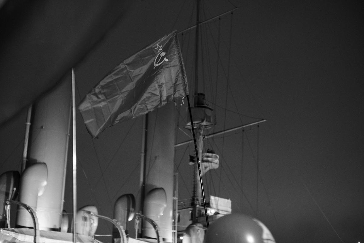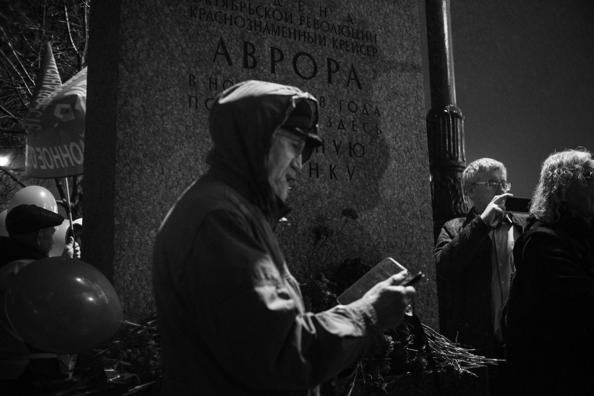 Традиционная акция коммунистов вечером 7 ноября прошла у символа Октябрьской революции — крейсера «Аврора». По наблюдениям журналистов MR7, отметить 108-ю годовщину Октября здесь собрались около трёхсот человек.