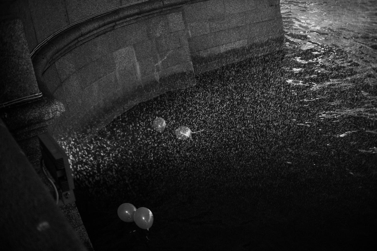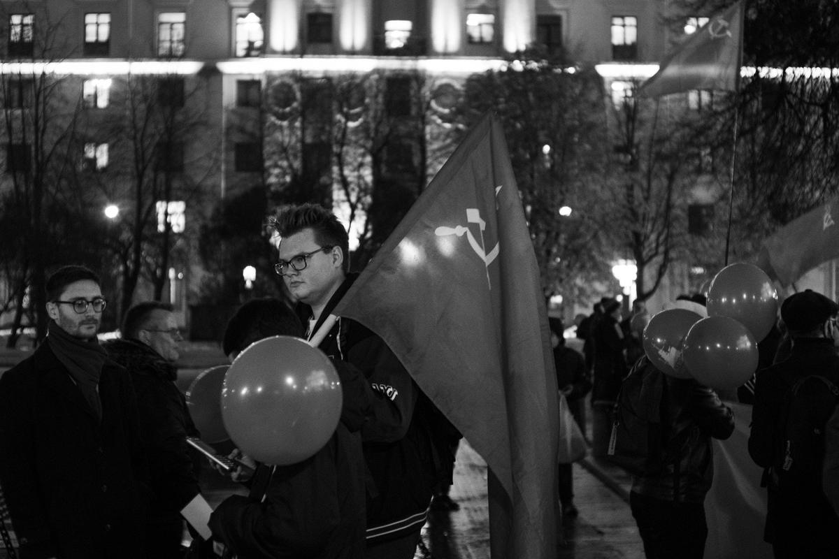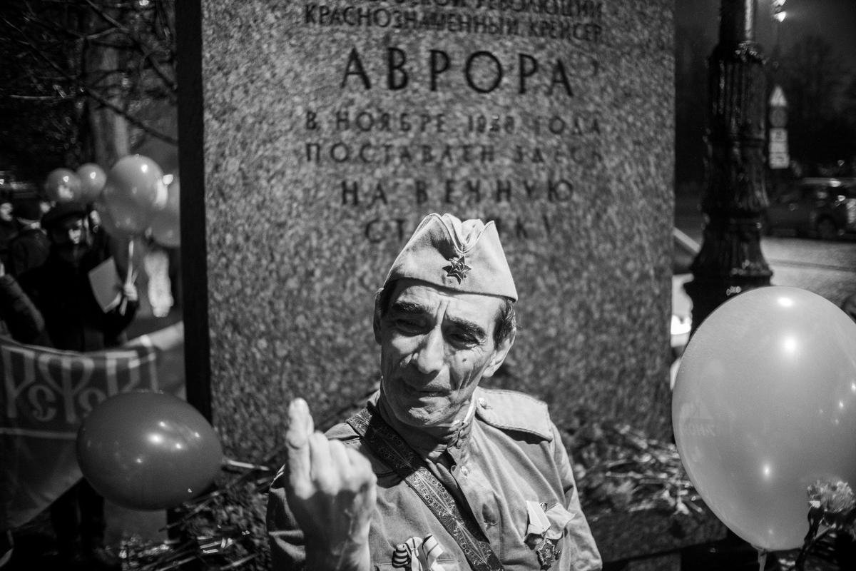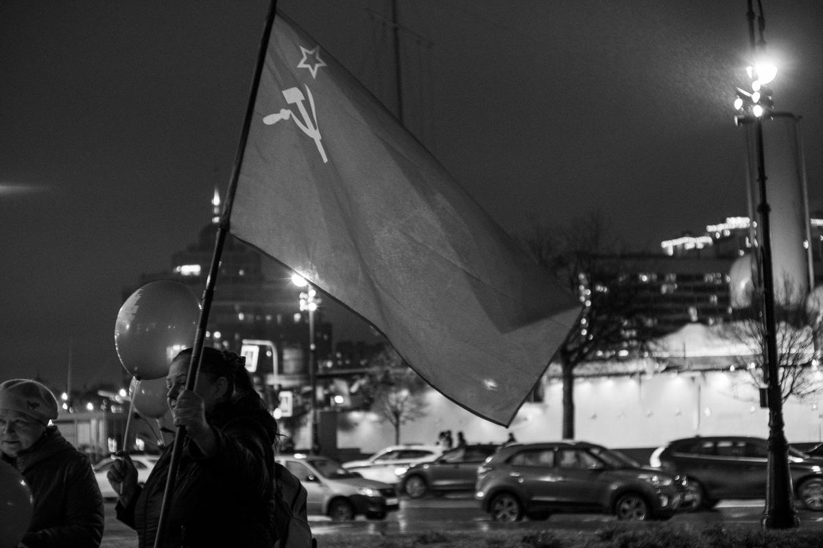 После 18:00 колонна коммунистов и комсомольцев переместилась из сквера у фонтана на набережной непосредственно к «Авроре». Гвоздики возложили к мемориальному знаку. Спели популярные песни. Раздали номер газеты «Призрак коммунизма». Рассказали туристке из Индии, что тут происходит. Оказалось, что она тоже «скрытая коммунистка» и от своих властей «устала». А вот вопрос об СВО Немиша назвала «страшным» и ограничилась рассуждением о разнице идеологий.