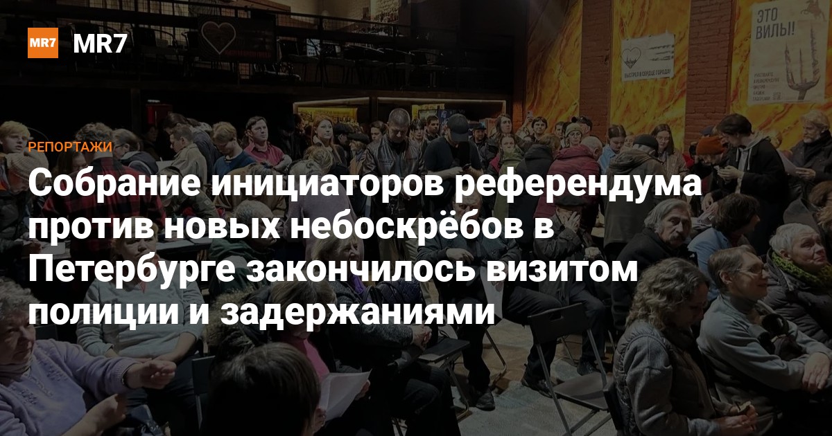 В клубе «Сердце» на Лиговском проспекте на собрание участников инициативной группы по проведению референдума по вопросу запрета строительства новых небоскрёбов в Петербурге 9 ноября пришла полиция. Хотя само собрание активисты и успели провести, именно сотрудники правоохранительных органов объявили о его окончании, а следом задержали двух участников.