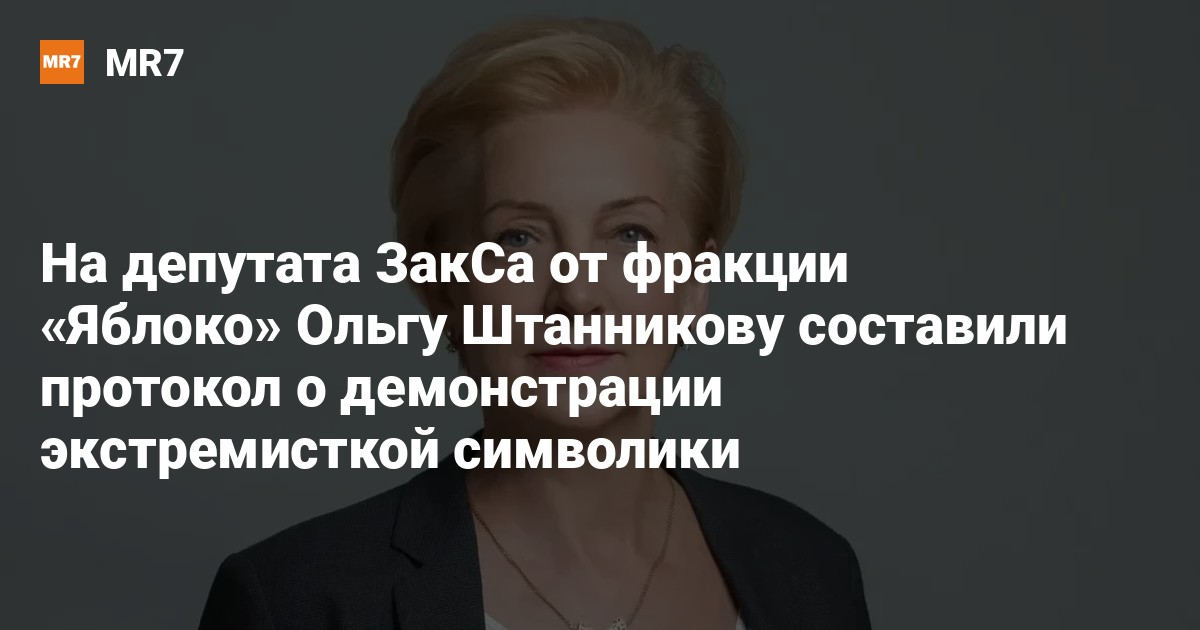 В Калининском районном суде зарегистрировано дело в отношении депутата ЗакСа Петербурга, члена партии «Яблоко» Ольги Штанниковой по части 1 статьи 20.3 КоАП — «публичное демонстрировании экстремистской символики». Карточка дела появилась накануне, 11 ноября.