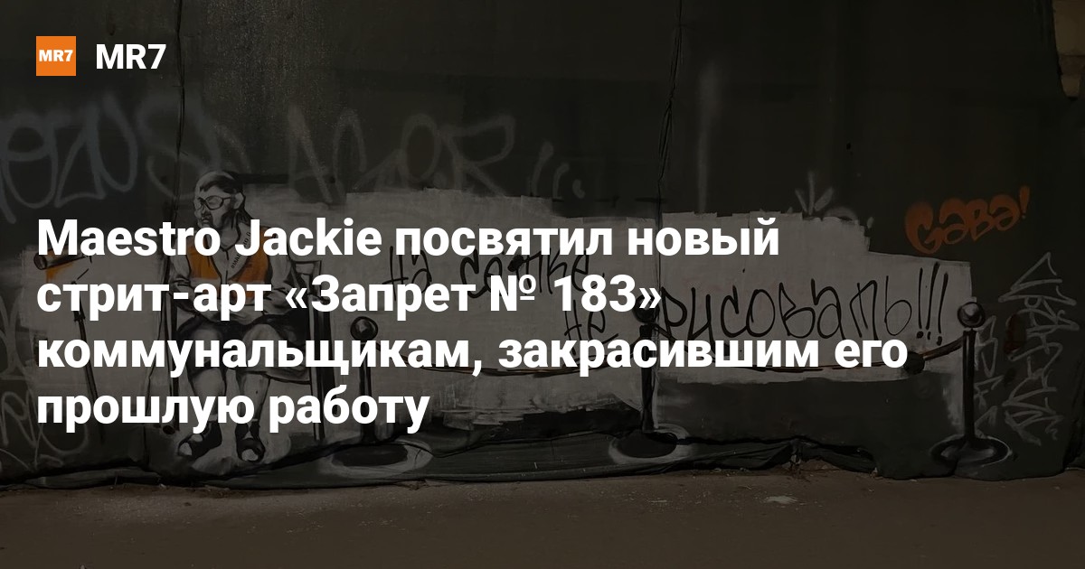 В Апраксином переулке, 18, появилась новая работа петербургского уличного художника Maestro Jackie под названием «Запрет № 183». Как сообщил 13 ноября сам автор в своём telegram-канале, этот стрит-арт стал ответом на действия коммунальных служб, закрасивших его предыдущую работу — оммаж российскому художнику Паше 183 под названием «Эстафета».