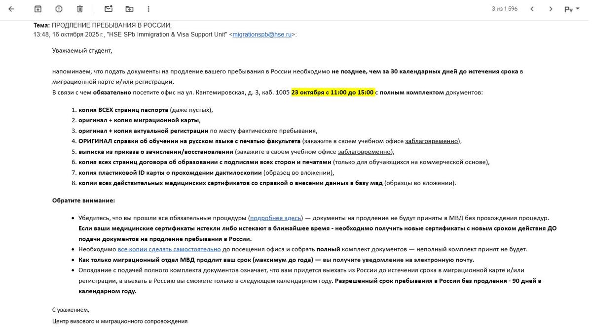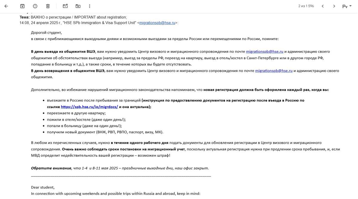 Рассылка для иностранных студентов в Высшей школе экономики. Скриншот: MR7