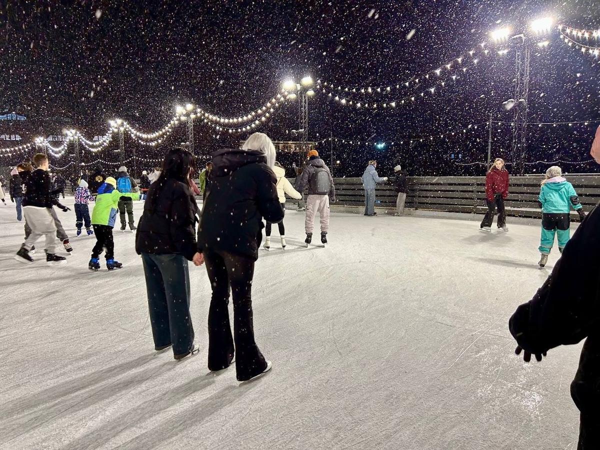 Каток находится на месте летнего большого газона, занимает площадь более 2000 квадратных метров и работает даже в плюсовую температуру.