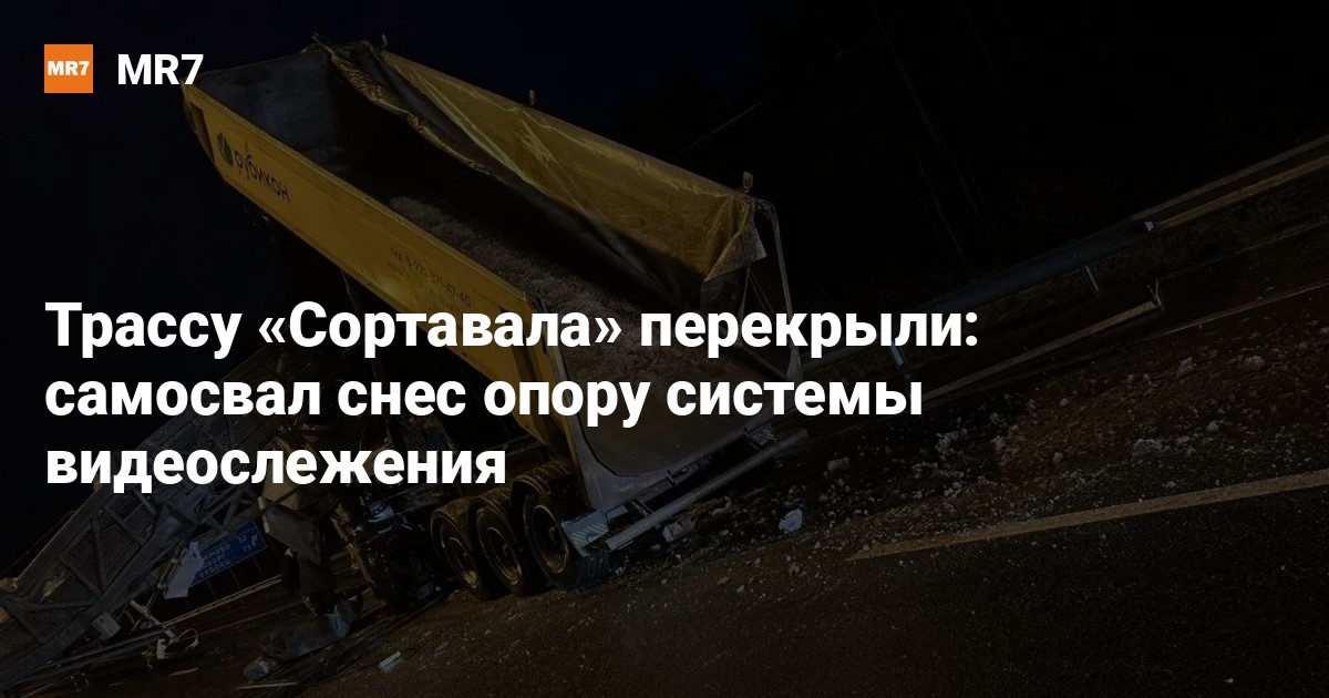 На 71-м километре трассы «Сортавала» утром 16 ноября самосвал повредил конструкцию с закрепленной на ней системой фиксации нарушений ПДД, из-за чего она рухнула на дорогу. Об этом сообщило ФКУ Упрдор «Северо-Запад». На месте ДТП работают дорожные службы.