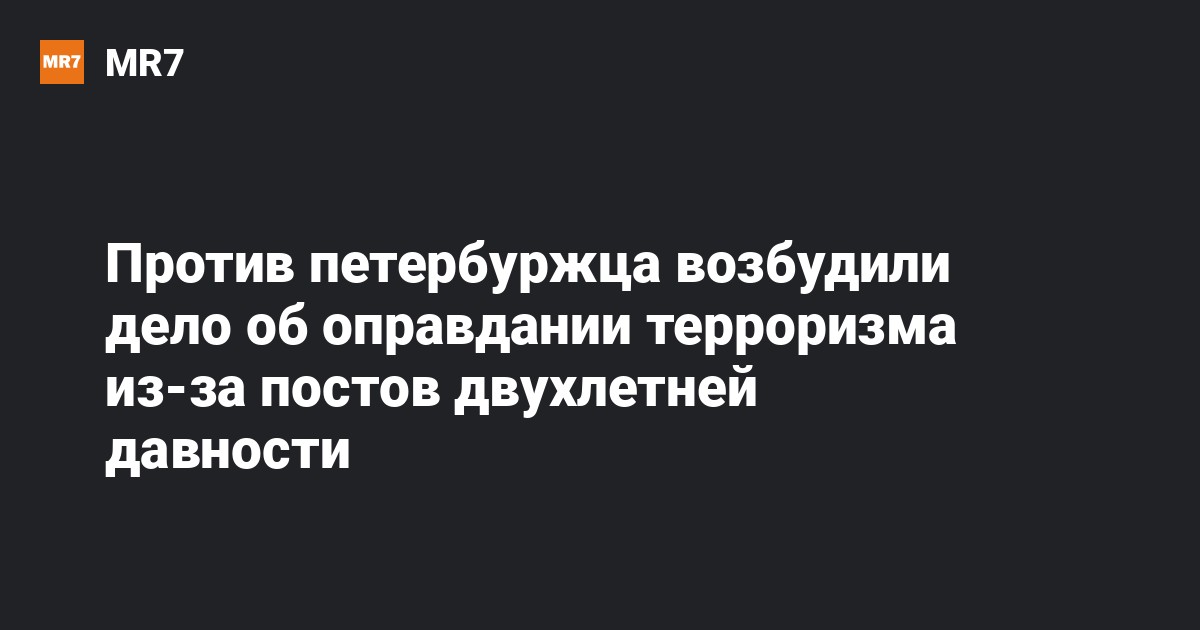 Петербургские правоохранители возбудили уголовное дело против 40-летнего жителя Калининского района. Его обвиняют по части 2 статьи 205.2 УК (публичное оправдание терроризма), о чем 17 ноября пишет ТАСС со ссылкой на источник в силовых структурах.