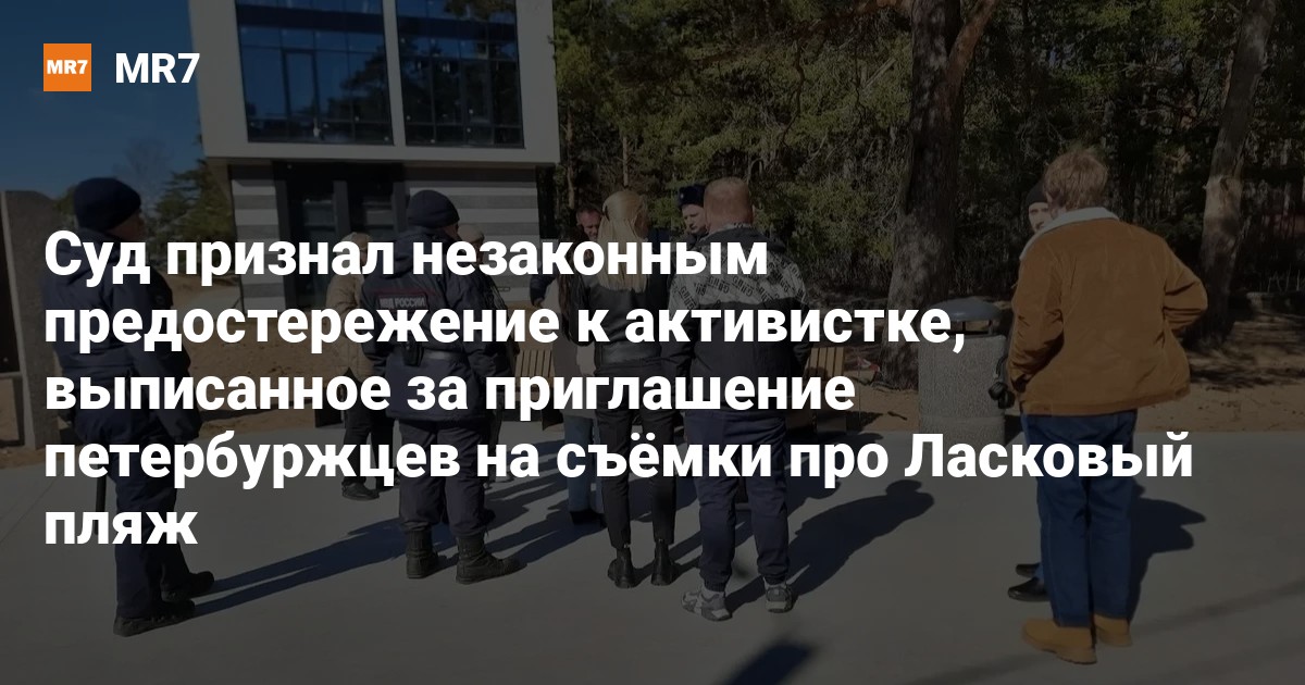 Сестрорецкий районный суд 20 ноября удовлетворил иск активистки Анны Шушпановой к ОМВД по Курортному району и признал незаконным предостережение за приглашение петербуржцев на съёмки про благоустройство Ласкового пляжа. Об этом 20 ноября сообщается в telegram-канале «Зелёный Курортный».