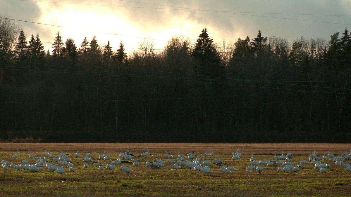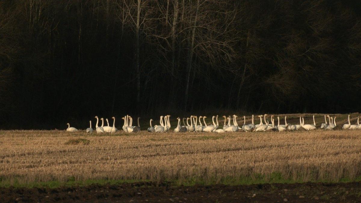 Весь необходимый урожай в этом сезоне на поле уже собрали, и теперь никто не мешает птицам лакомиться остатками даров земли. Окрестные жители рассказывают, что лебеди уже несколько недель представляют собой часть пейзажа и что их численность только растет.
