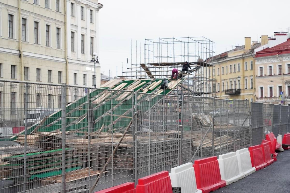 Так, на Дворцовой площади приступили к возведению большой горки. И уже видны её будущие очертания. Горка высотой восемь метров расположится между Дворцовой площадью и Певческим мостом. Вблизи будут новогодние украшения и ярко оформленные торговые павильоны.