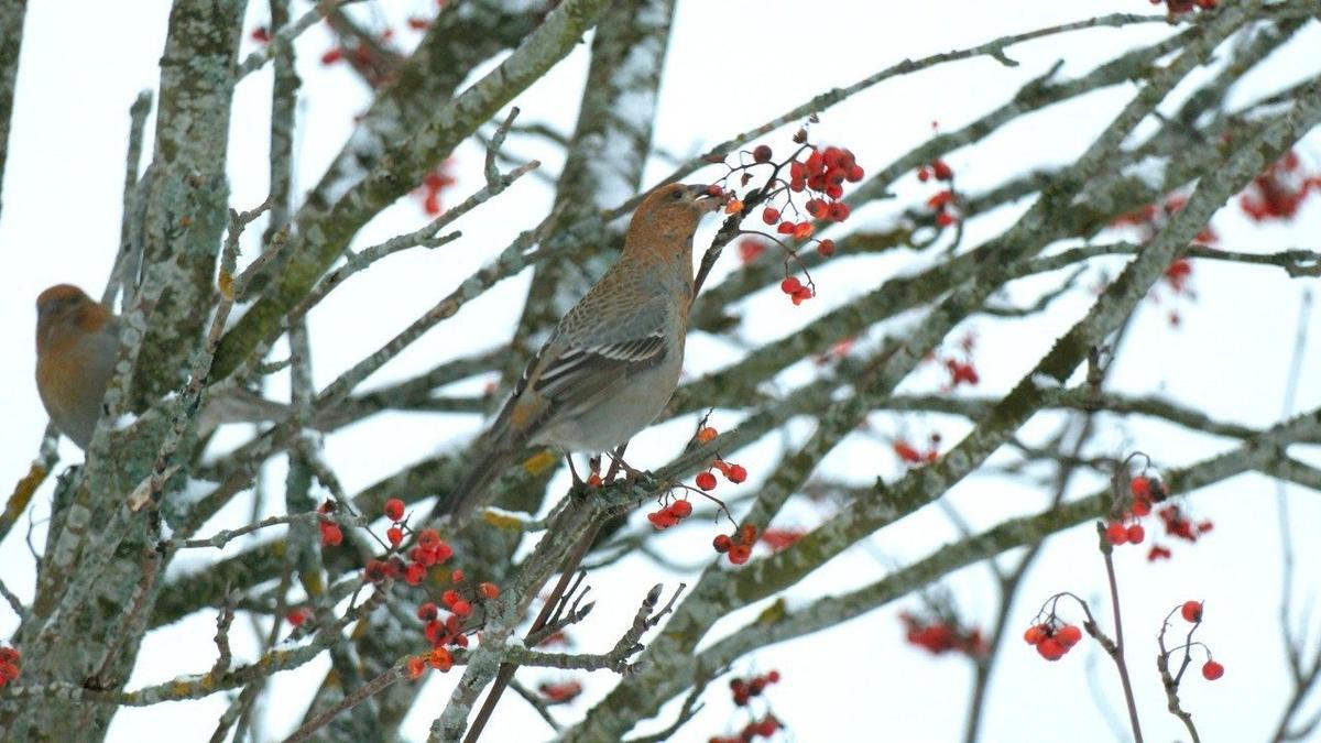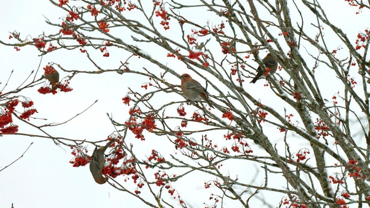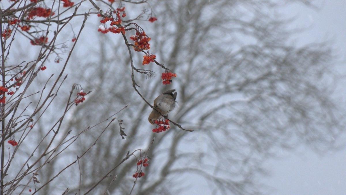 В Северо-Западном регионе в этом году таежных птиц привлекли ягоды рябины, массово выглядывающие из-под снега, которым покрыло ветви. Это любимое угощение щуров.
