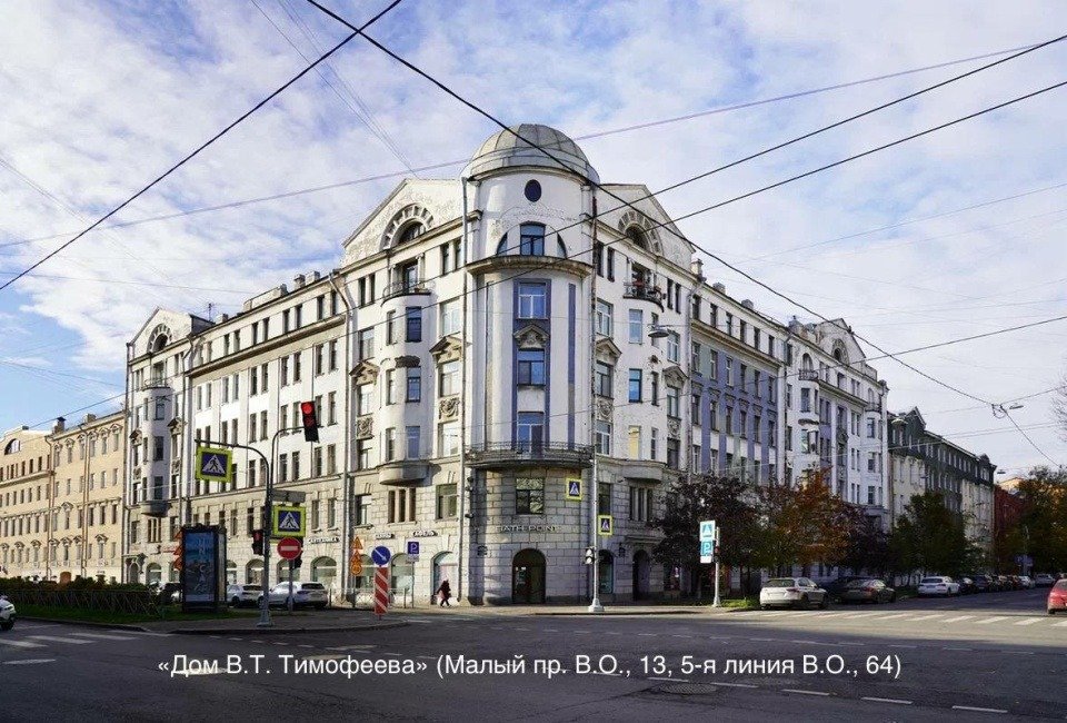 - «Дом В.Т. Тимофеева» (Малый пр. В.О., 13; 5-я линия В.О., 64);