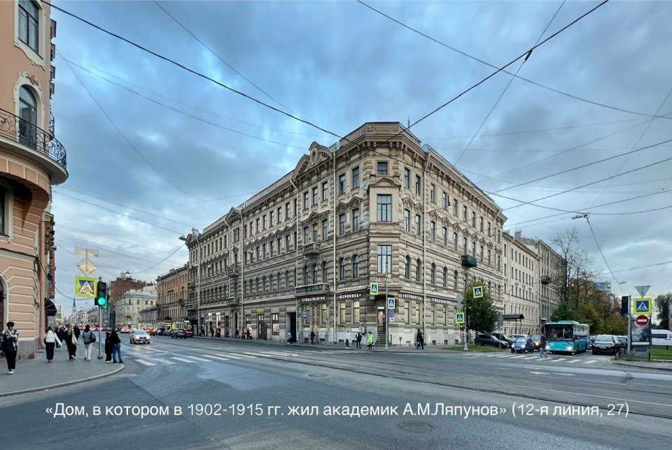 - «Дом, в котором в 1902-1915 гг. жил академик А.М.Ляпунов» (12-я линия В.О., 27);