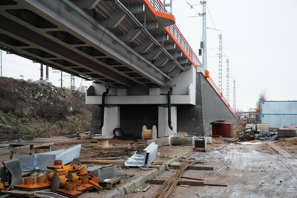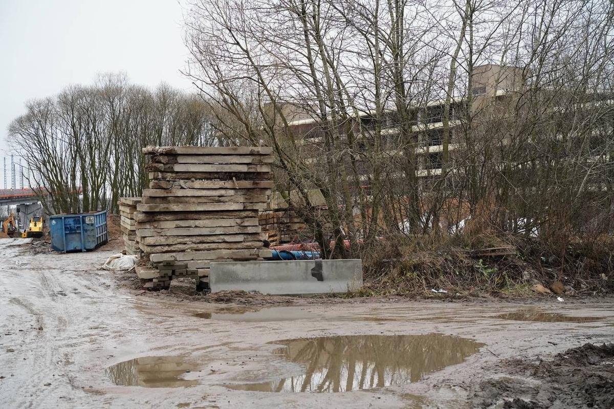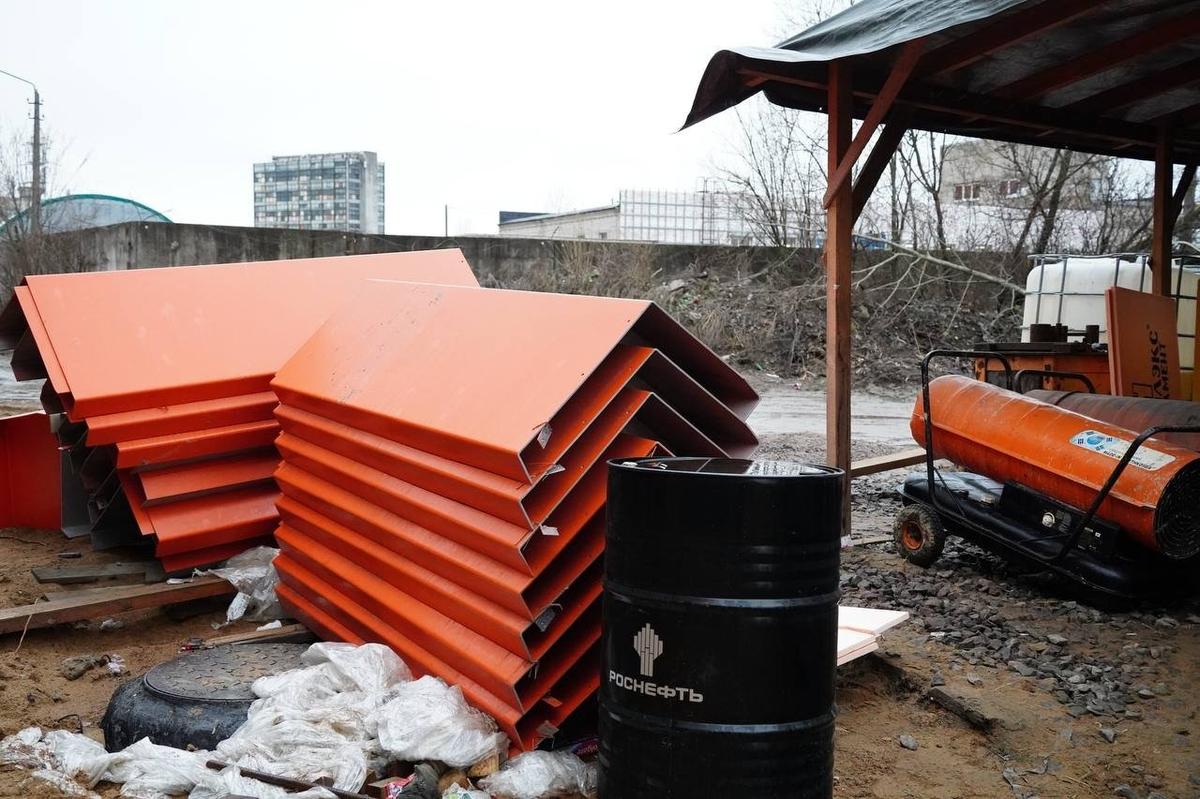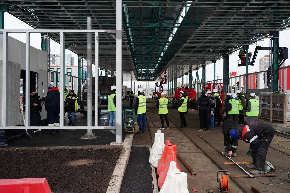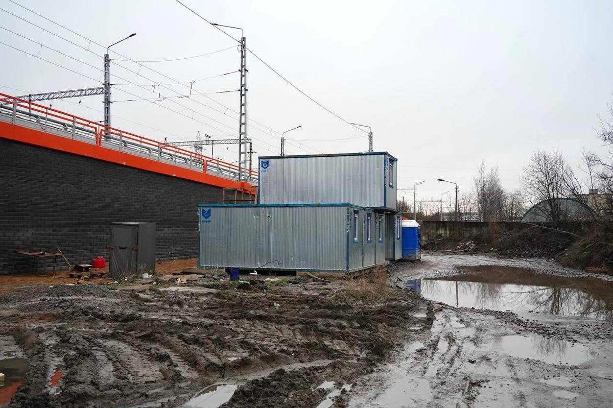 На пару метров новая линия равняется с землёй. Напротив рельсовой дороги располагаются административные здания, а вдоль разбросаны бытовки. Рядом с рабочими домиками лежат перчатки, валики в вёдрах с мутной водой, бутылки, доски, облицовочные детали, которым не нашли места.