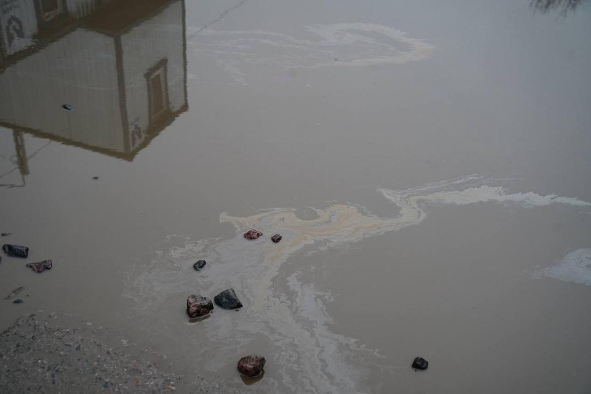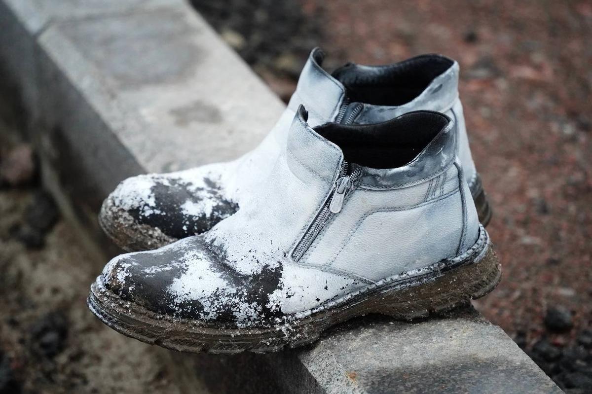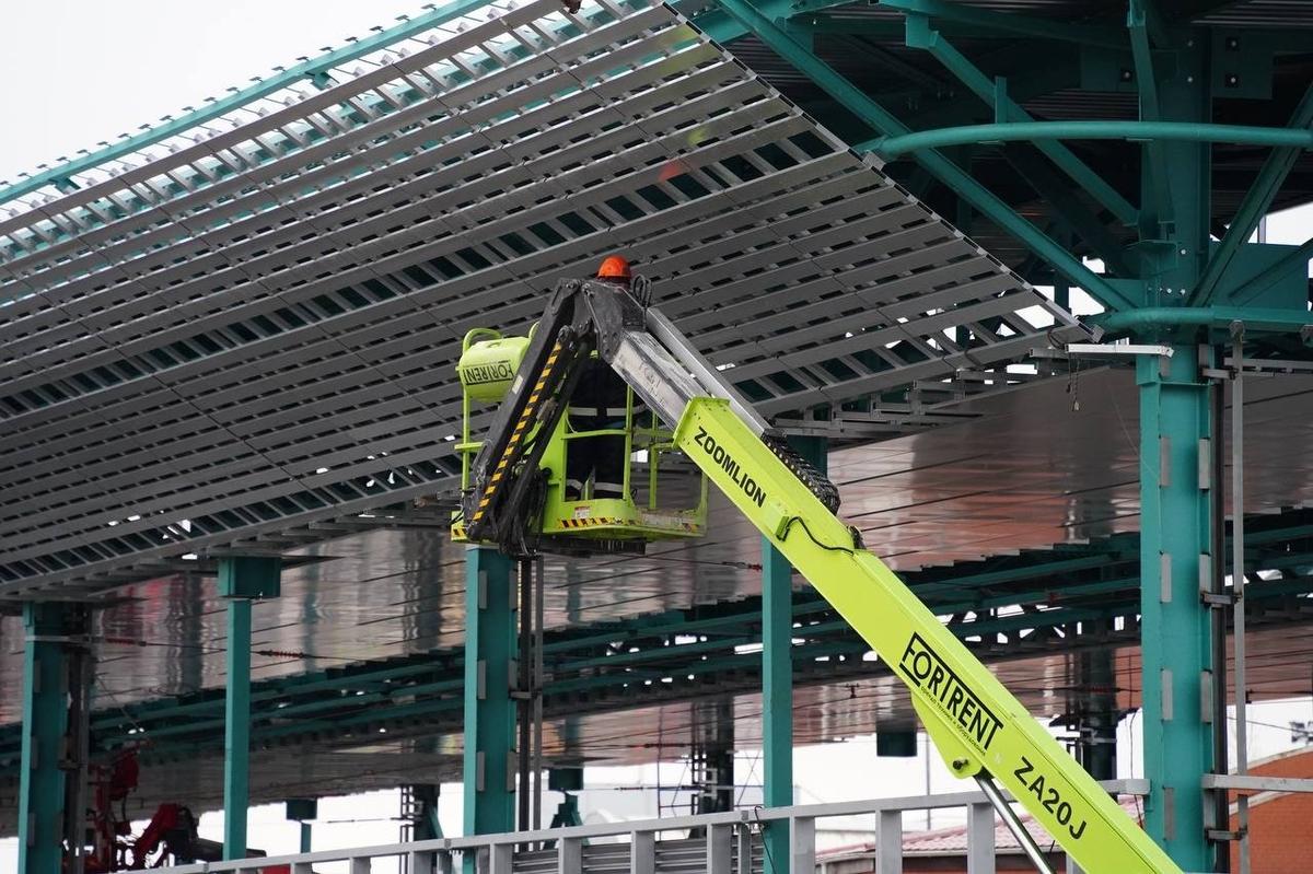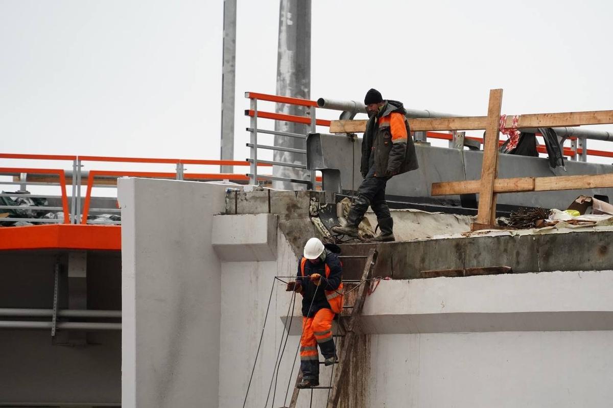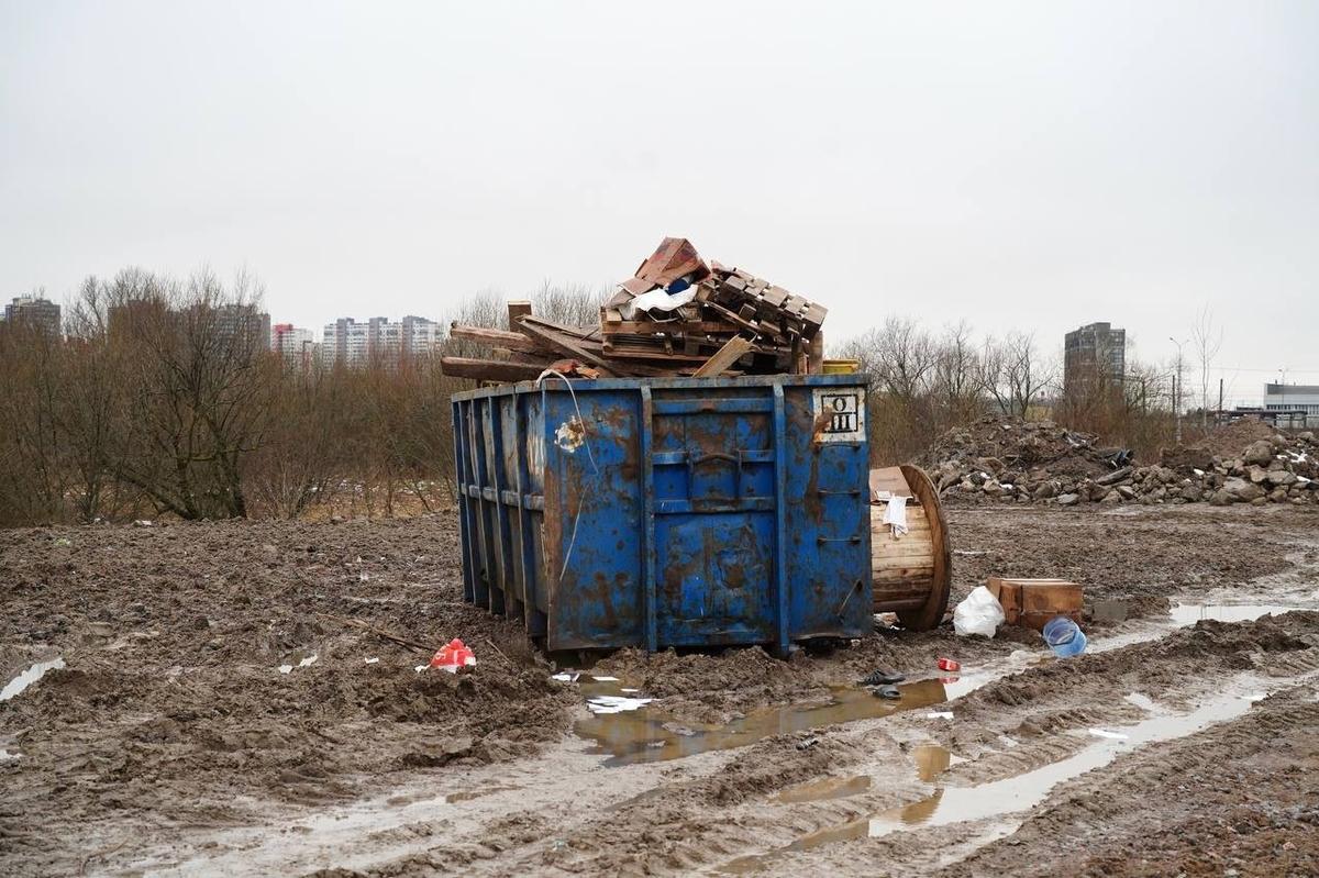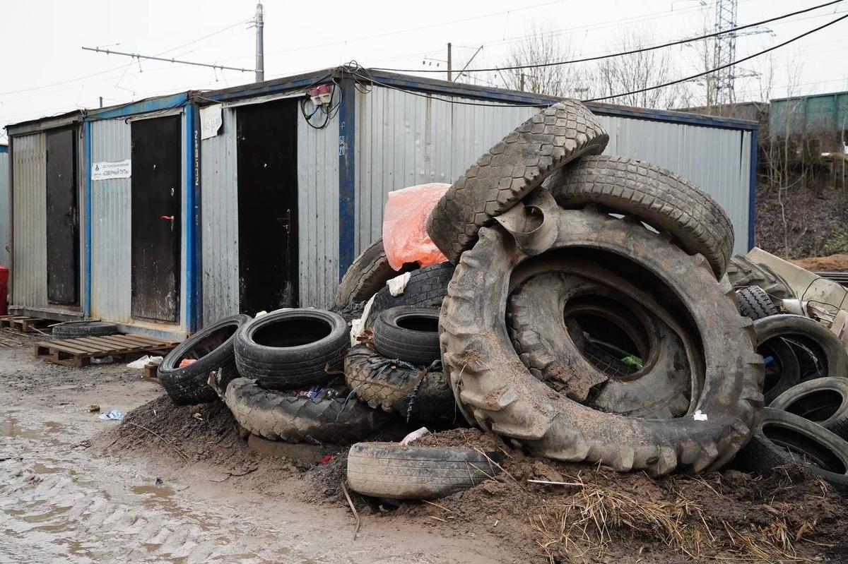 На пару метров новая линия равняется с землёй. Напротив рельсовой дороги располагаются административные здания, а вдоль разбросаны бытовки. Рядом с рабочими домиками лежат перчатки, валики в вёдрах с мутной водой, бутылки, доски, облицовочные детали, которым не нашли места.