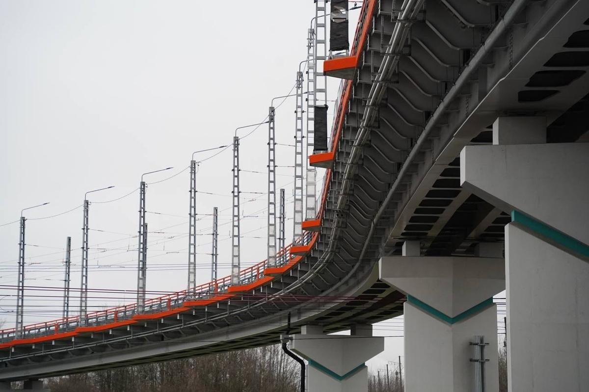 От беспорядка трамвайные пути вновь уходят вверх. Эстакада проходит сначала над Московским шоссе, а после парит над 66-м километром кольцевой.