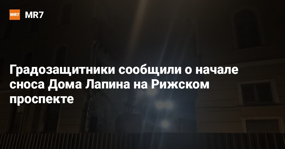 Градозащитники сообщили 3 декабря о начале сноса Дома Лапина на Рижском проспекте, 24, компанией Setl. По их данным, здание обладает признаками объекта культурного наследия и в отношении него подано заявление о выявлении как памятника. Об этом сообщают в «SOS СПб СНОС».