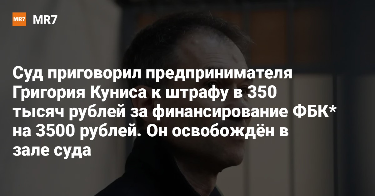 В Петроградском районном суде оглашён приговор экс-владельцу издания «Мой район», предпринимателю Григорию Кунису. Судья Ольга Кудашкина признала его виновным по статье о финансировании экстремисткой деятельности и назначила наказание: штраф 350 тысяч рублей.