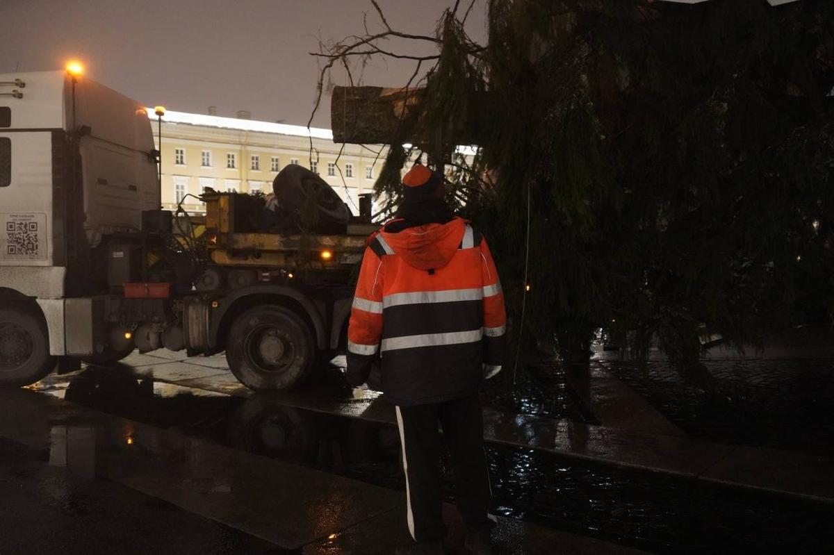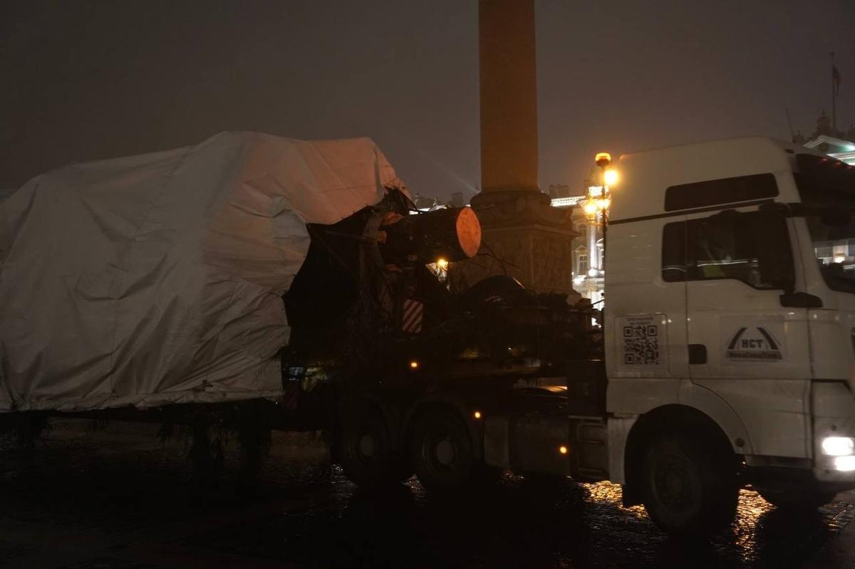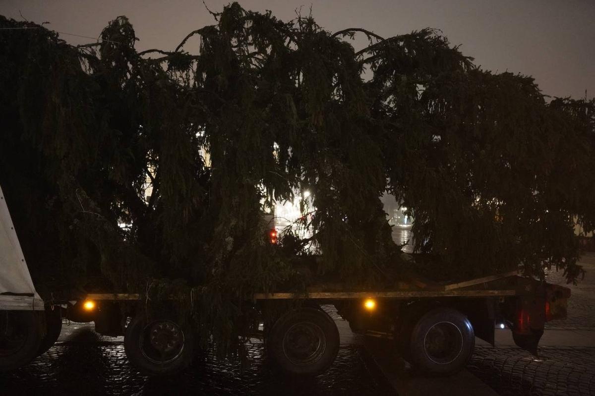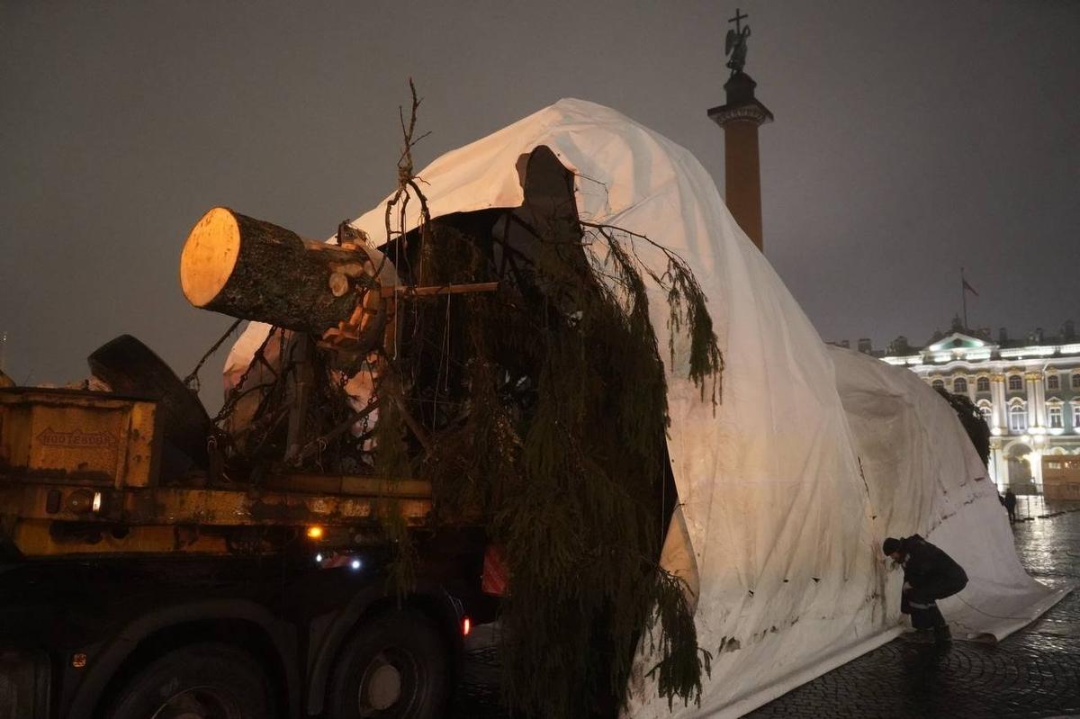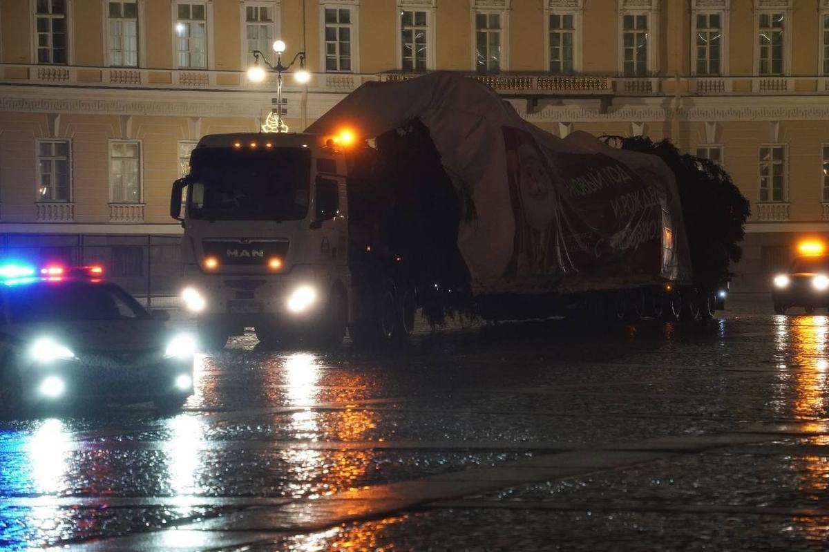 Дерево привезли из Копорского лесничества. Её выбрали ещё в конце ноября, а накануне срубили и погрузили на спецмашину. Но в городе транспорт с ценным грузом появился уже сильно заполночь, когда на улицах стало меньше машин.
