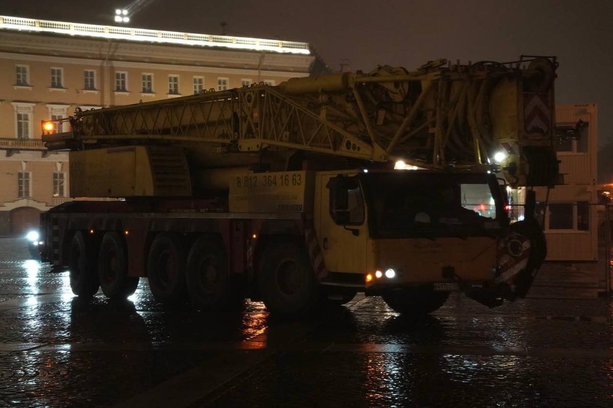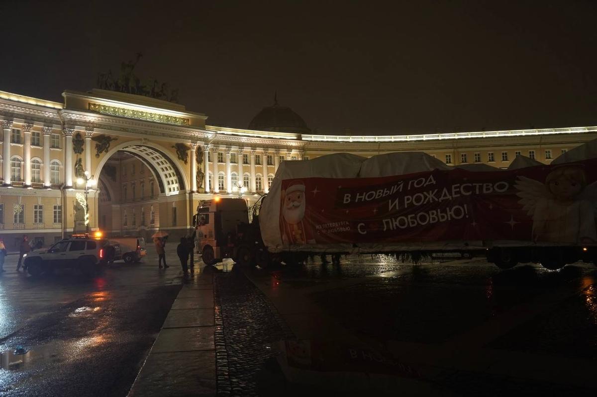 Главная новогодняя ёлка Петербурга появилась на Дворцовой примерно в 2:30 ночи.