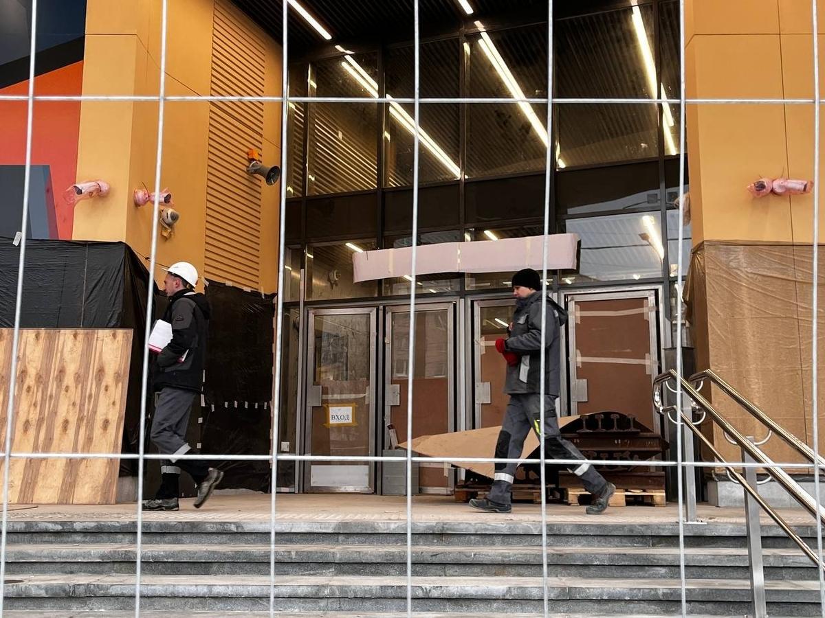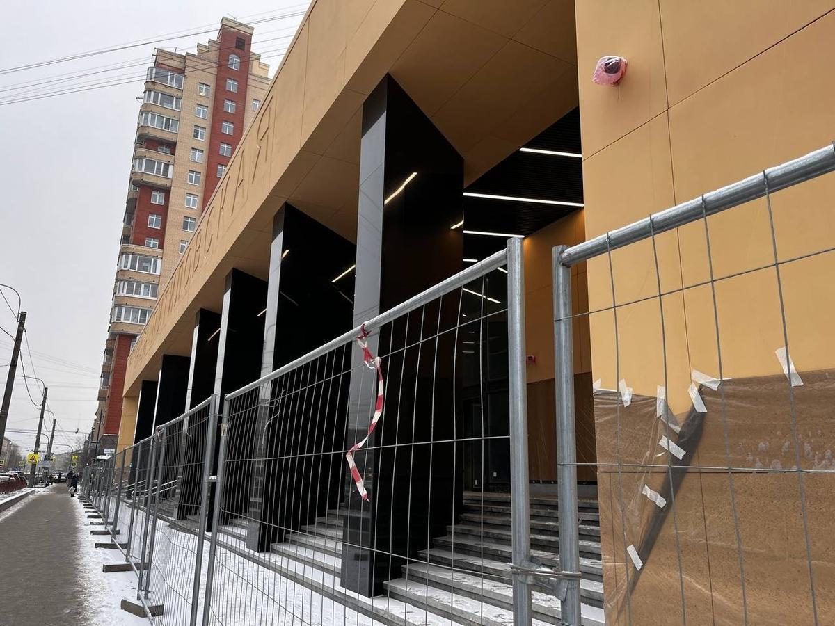 Снаружи вестибюль «Путиловской» готов в части отделки, но к открытию — пока нет. У входа лежат стройматериалы, а некоторые элементы закрыты плёнкой. Сам вестибюль огорожен забором.