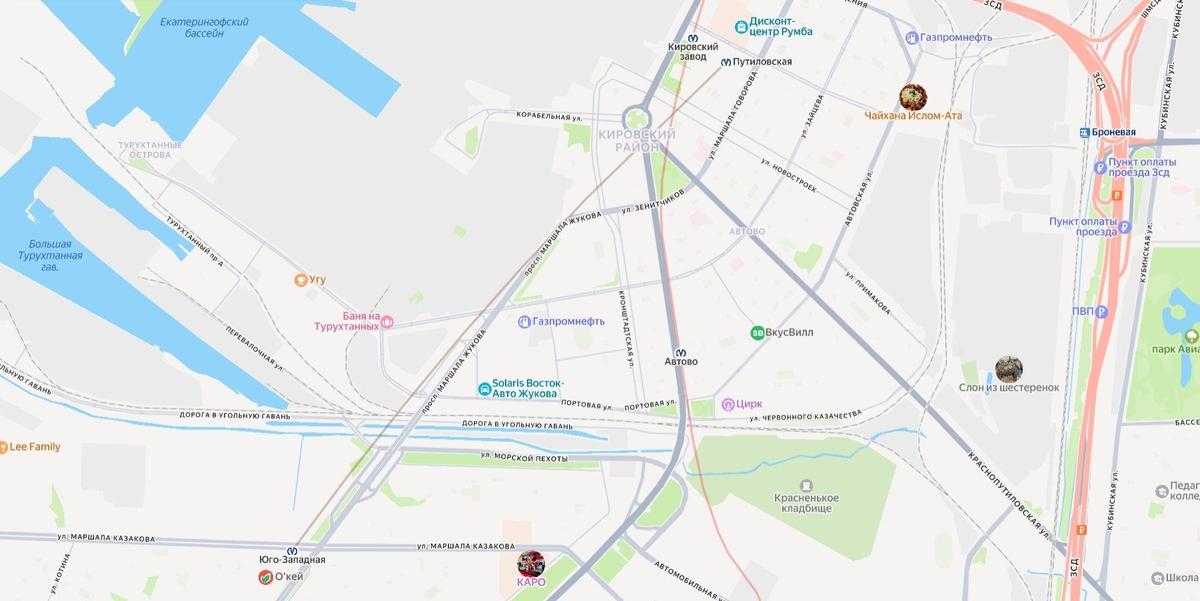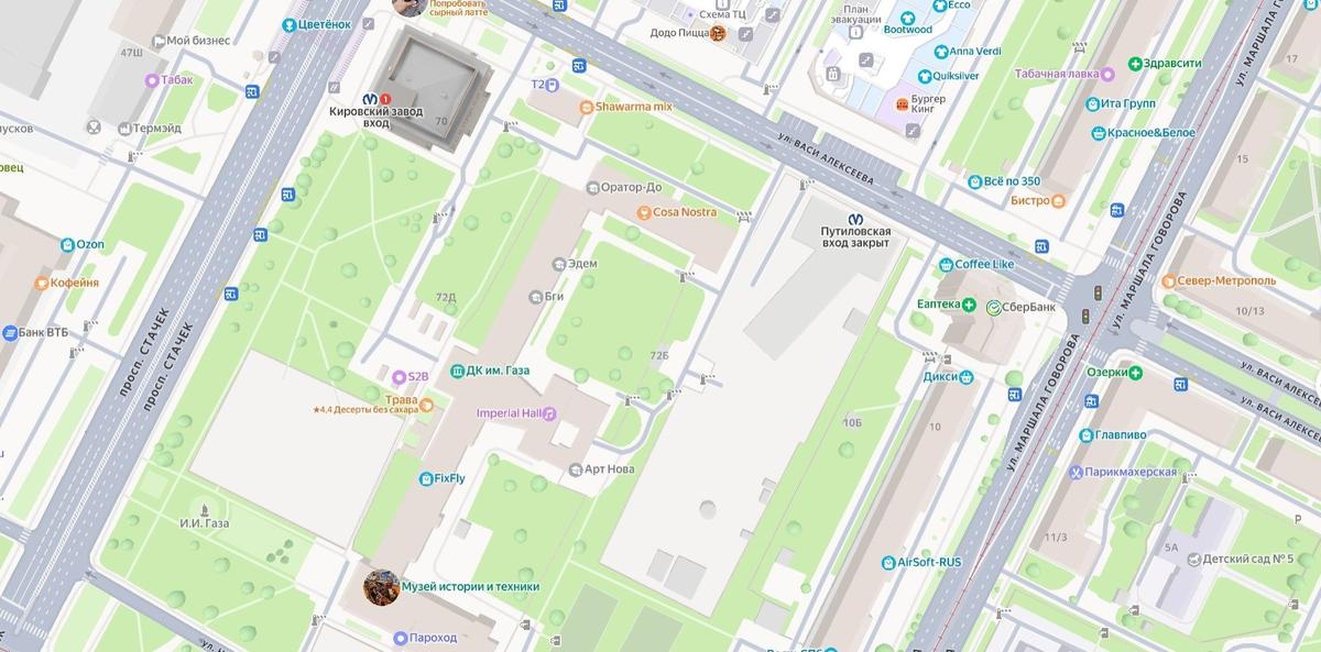 Накануне станции коричневой линии нанесли на карты. Если изменить масштаб карт, рядом с «Путиловской» и «Юго-Западной» появится пометка «вход закрыт».
